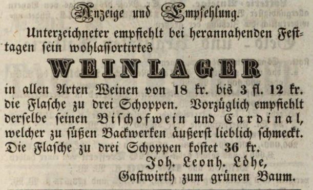 | Dateiinfo (Bild-Unterschrift und Info-Box, automatisch erstellt) | Zeitungsanzeige von Johann Leonhard Löhe, Wirt zum grünen Baum, Dezember 1843 Lizenz: NoC-NC 1.0 | ||