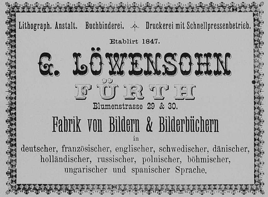 | Dateiinfo (Bild-Unterschrift und Info-Box, automatisch erstellt) | Anzeige G. Löwensohn 1859 im Fürther Adressbuch Lizenz: CC BY-SA 3.0 | ||