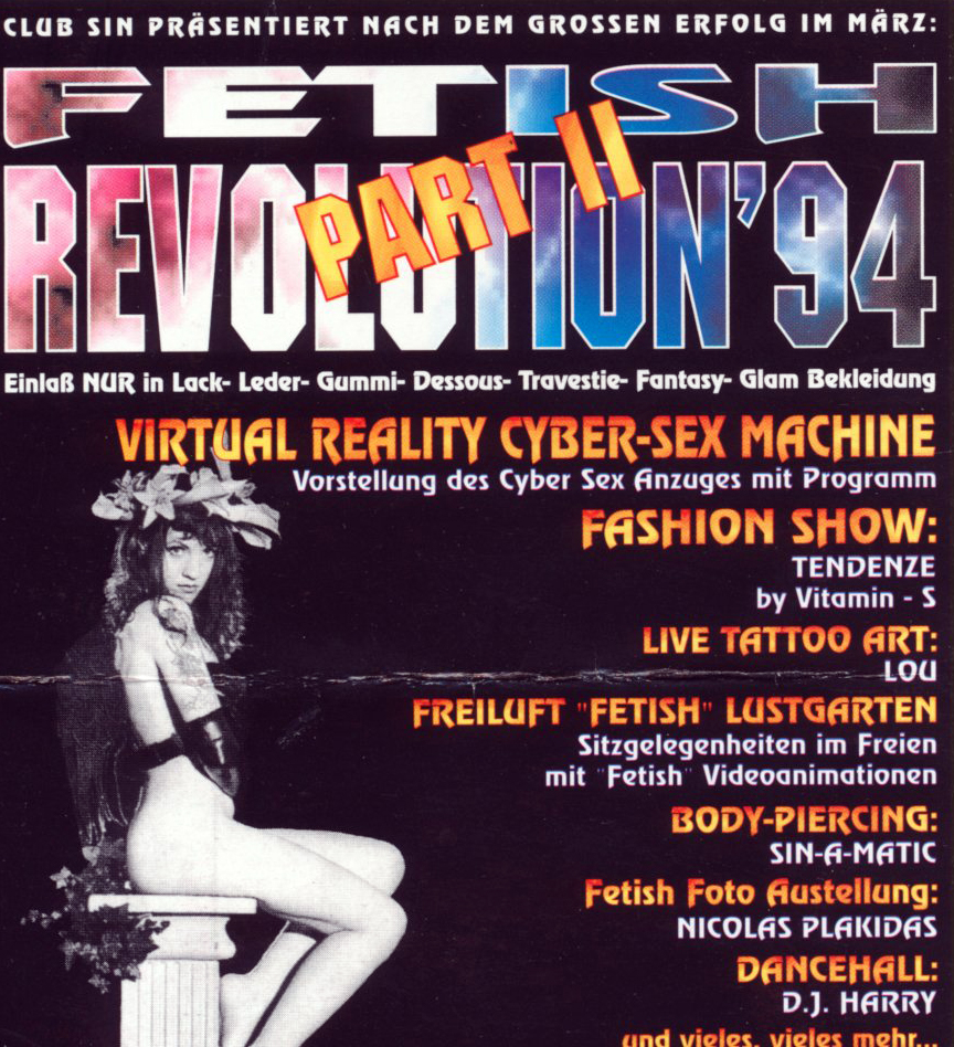 | Dateiinfo (Bild-Unterschrift und Info-Box, automatisch erstellt) | Werbeplakat für die Fetish Revolution 1994 - Part II - im ehem. Lancia Odeon in der Südstadt, 1994 Lizenz: copyright | ||
