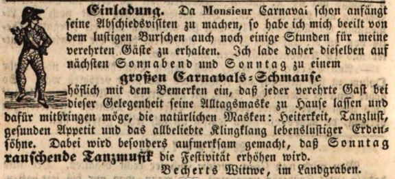 | Beschreibung | Werbeannonce für eine Faschingsveranstaltung im Lokal im Landgraben, Februar 1840 | ||