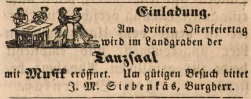 | Dateiinfo (Bild-Unterschrift und Info-Box, automatisch erstellt) | Zeitungsannonce von J. M. Siebenkäs, Wirt im Landgraben, April 1849 Lizenz: NoC-NC 1.0 | ||