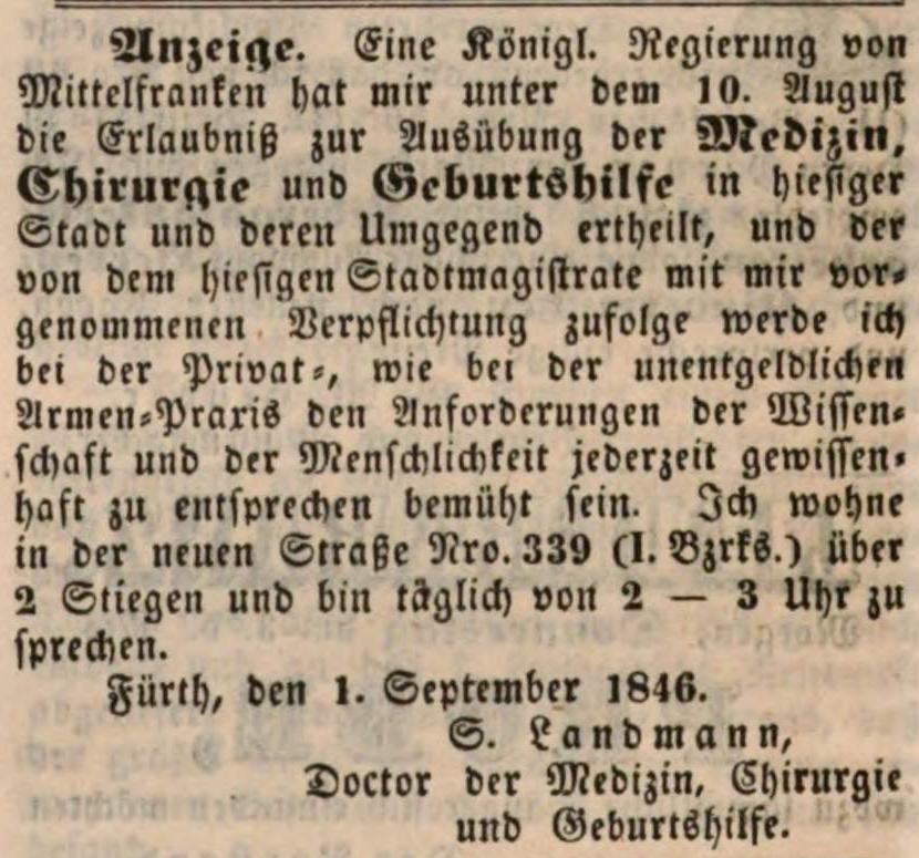 | Beschreibung | Zeitungsanzeige von Samson Landmann bzgl. seiner Niederlassung als Arzt in Fürth, September 1846 | ||