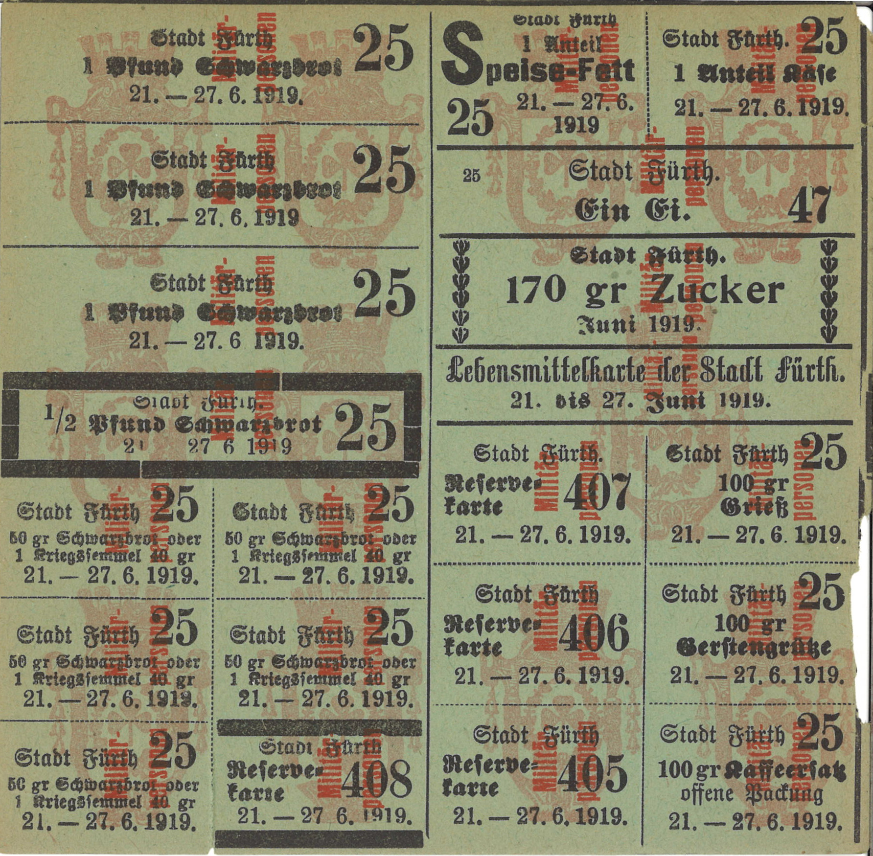 | Beschreibung | Lebensmittelkarte der Stadt Fürth, gültig in der Kalenderwoche 25/1919, mit Mengenangabe der zu beziehenden Produkte | ||