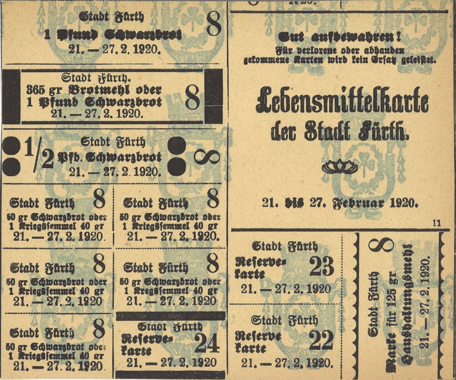 | Dateiinfo (Bild-Unterschrift und Info-Box, automatisch erstellt) | Lebensmittelkarte der Stadt Fürth, benutzt, gültig in der Kalenderwoche 8/1920, mit Mengenangabe der ... Lebensmittelkarte der Stadt Fürth, benutzt, gültig in der Kalenderwoche 8/1920, mit Mengenangabe der zu beziehenden Produkte<br><br>Lizenz: CC BY-SA 3.0 | ||