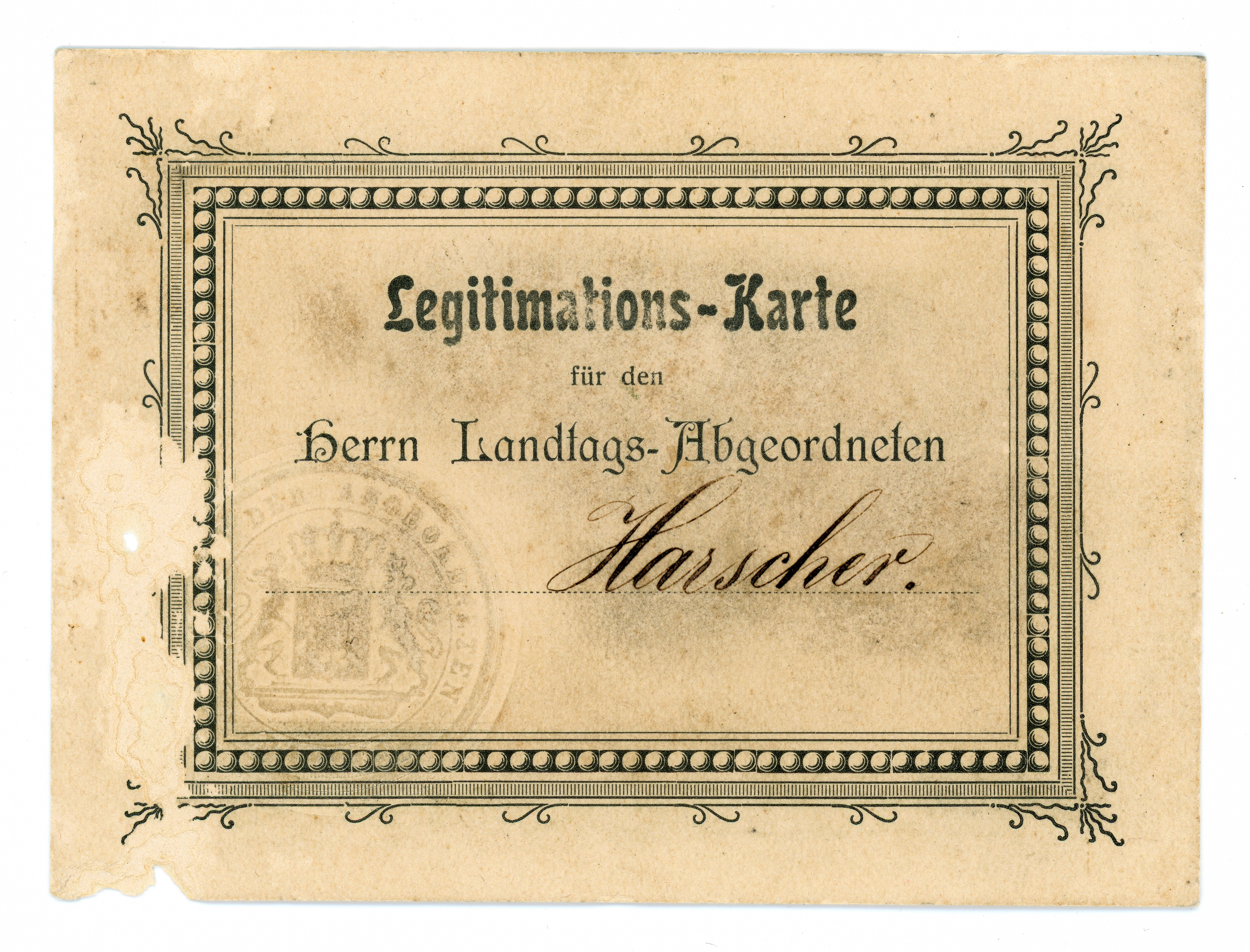 | Beschreibung | Legitimationskarte für den ehem. Landtagsabgeordneten Georg Harscher für den Bay. Landtag, ca. 1911 | ||