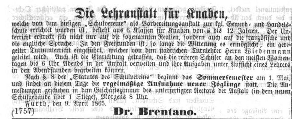 | Beschreibung | Lehranstalt für Knaben, Fürther Abendzeitung 9.4.1865 | ||