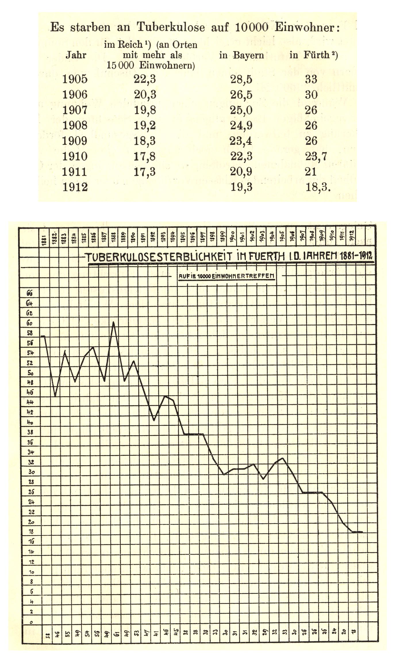 | Beschreibung | Tuberkulosesterblichkeit in Fürth von 1881 bis 1912. | ||