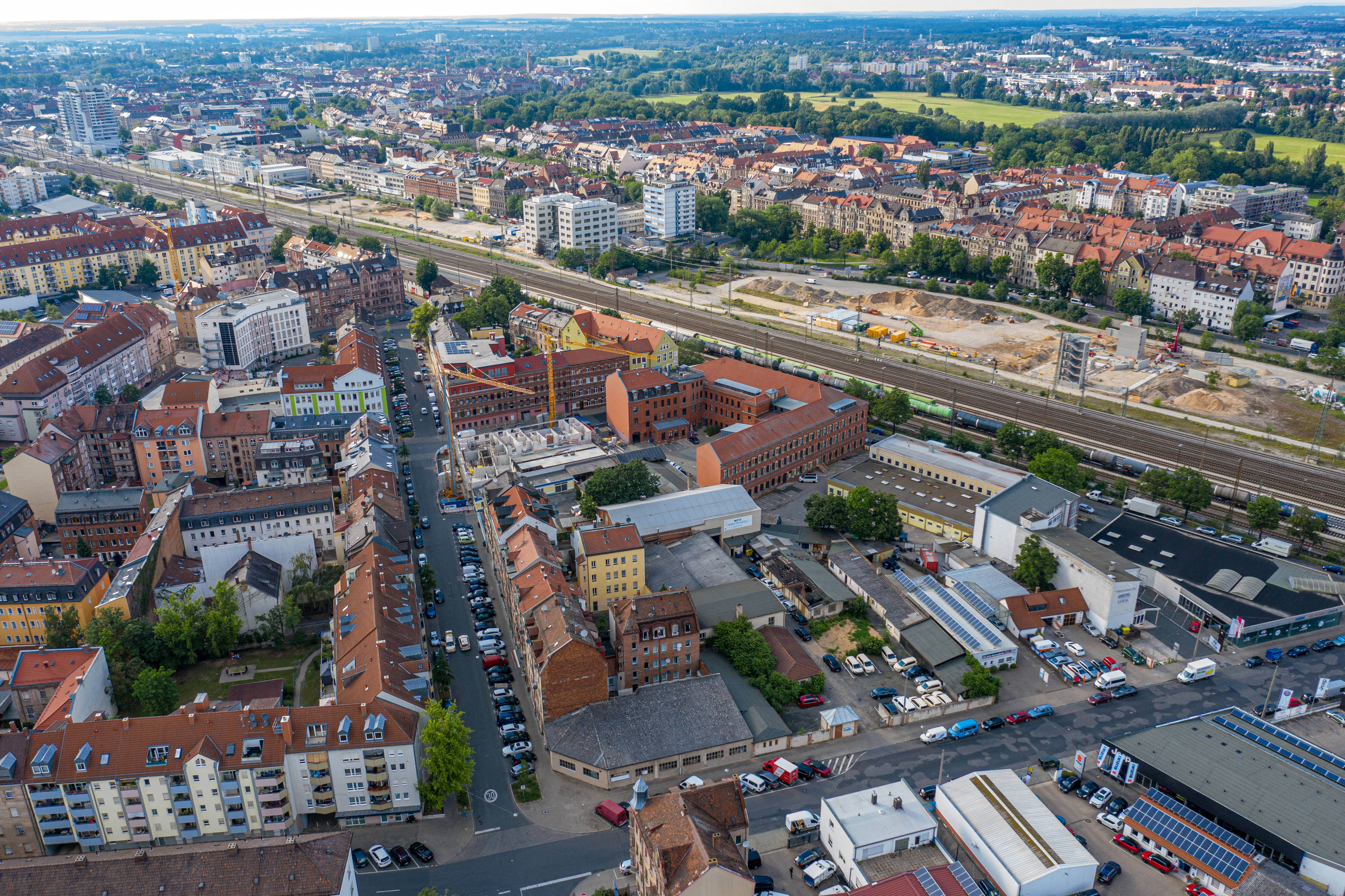 | Beschreibung | Blick über die Leyher- und Kaiserstraße in der Südstadt, im Hintergrund das Baufeld entlang der Gebhardtstraße, Juni 2020 | ||
