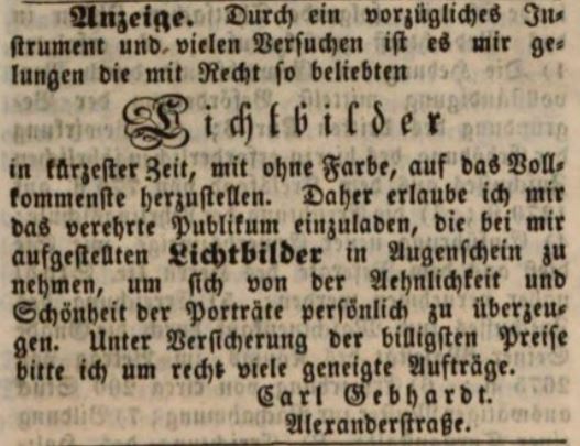 | Beschreibung | Carl Gebhardt wirbt damit, Lichtbilder herzustellen, April 1846 | ||