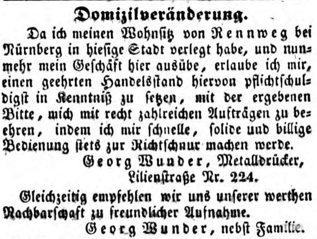 | Beschreibung | Zeitungsannonce des Metalldrückers G. Wunder in der damaligen Lilienstraße 224, August 1851 | ||