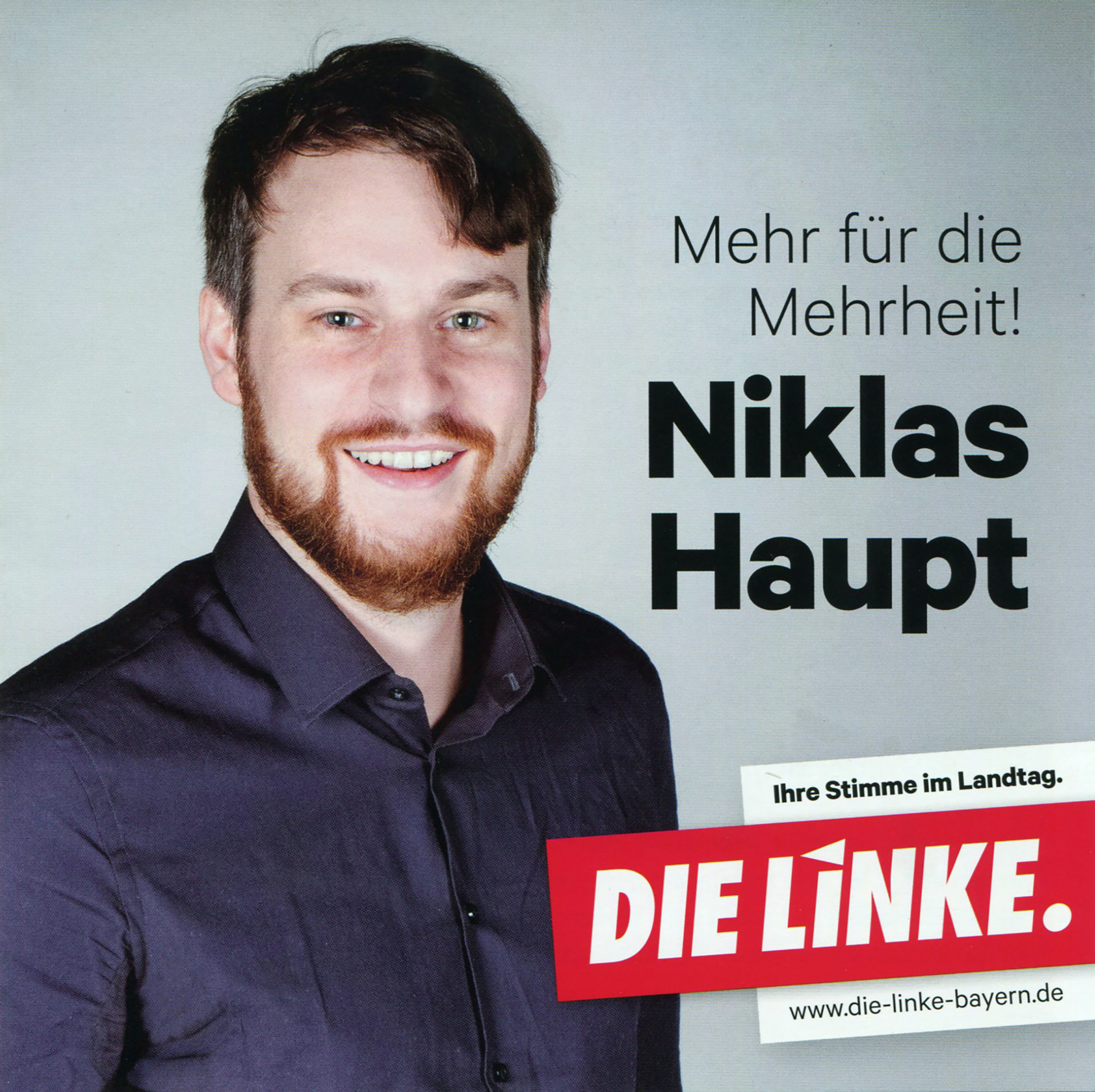 | Dateiinfo (Bild-Unterschrift und Info-Box, automatisch erstellt) | Wahlkampfpostkarte von Niklas Haupt von den Linken zur Landtagswahl 2018 Urheber: Linke Fürth<br><br>Lizenz: CC BY-SA 3.0 | ||