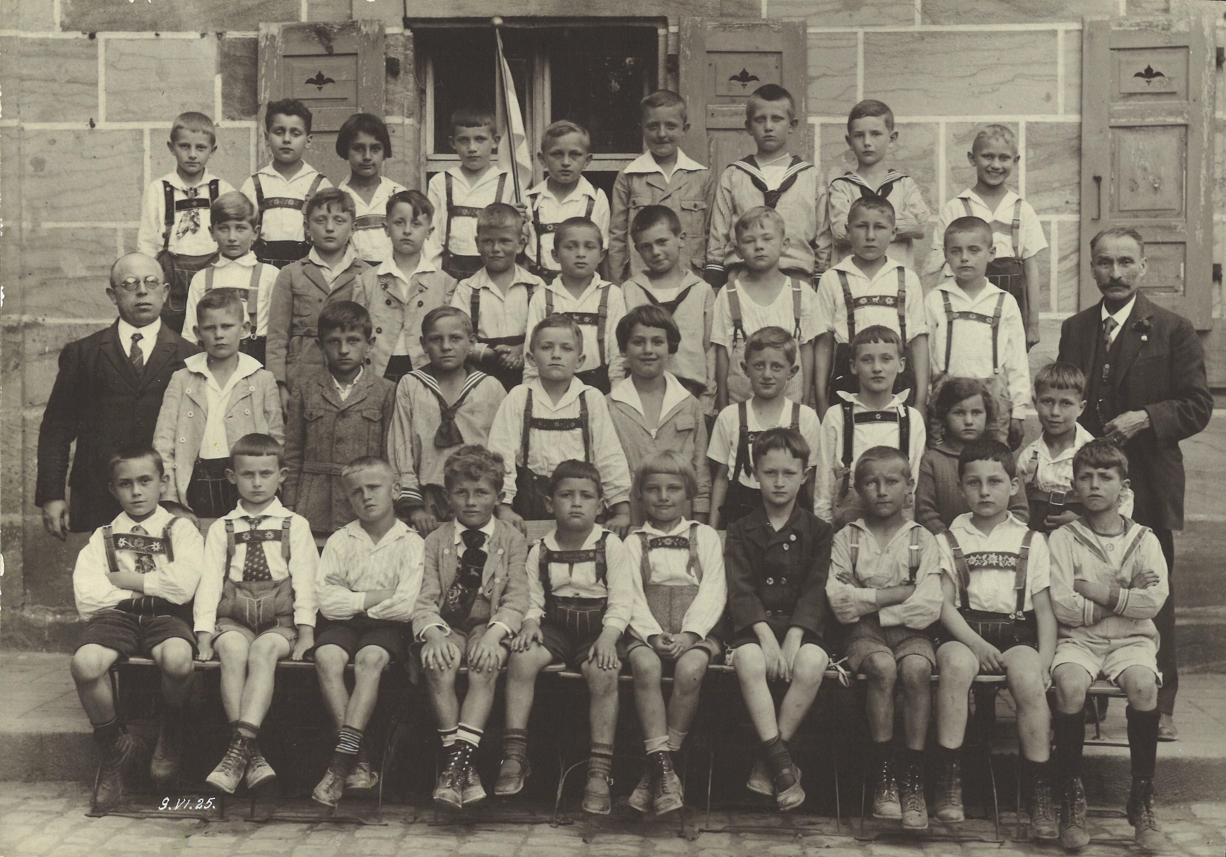 | Beschreibung | Klassenfoto eines Jahrgangs der Heckmannschule, vermutlich vor dem Schulgebäude. Schüler Otto Lippert (Sohn von Wolfgang Lippert) in der untersten Reihe, vierter von links. Original-Bildunterschrift: "9.VI.25. Heckmann'sche Privatschule Fürth 1921/25" | ||