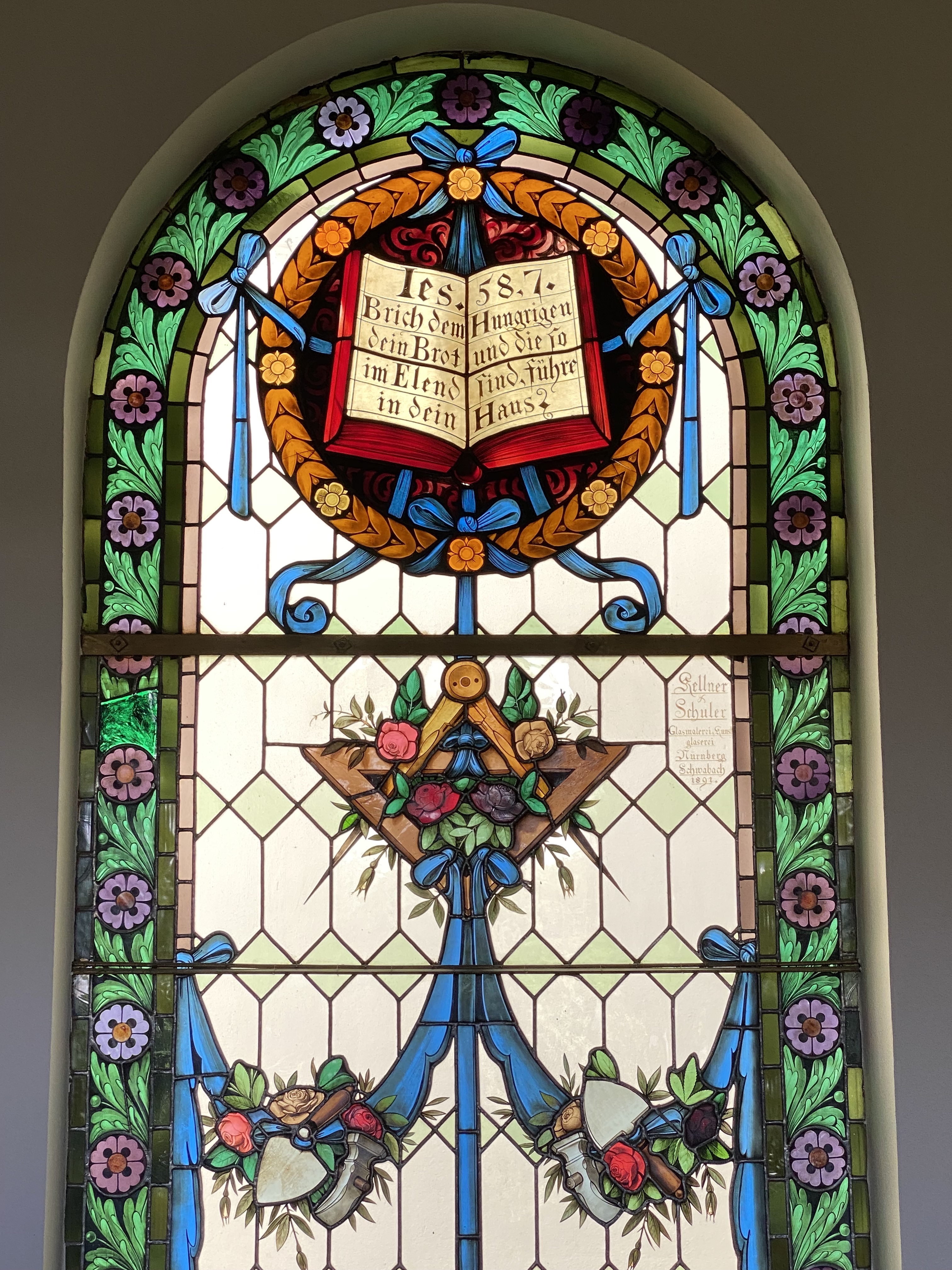 | Beschreibung | Treppenaufgang im Logenhaus: Reich gestaltete Blei-Verglasung im Fenster zum Lichthof (Detailaufnahme) | ||