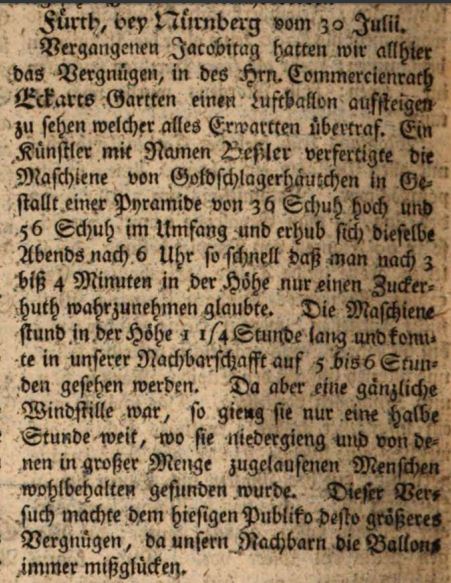 | Beschreibung | Beschreibung eines erfolgreichen Luftballon-Tests in der Bayreuther Zeitung vom 3. August 1785 | ||