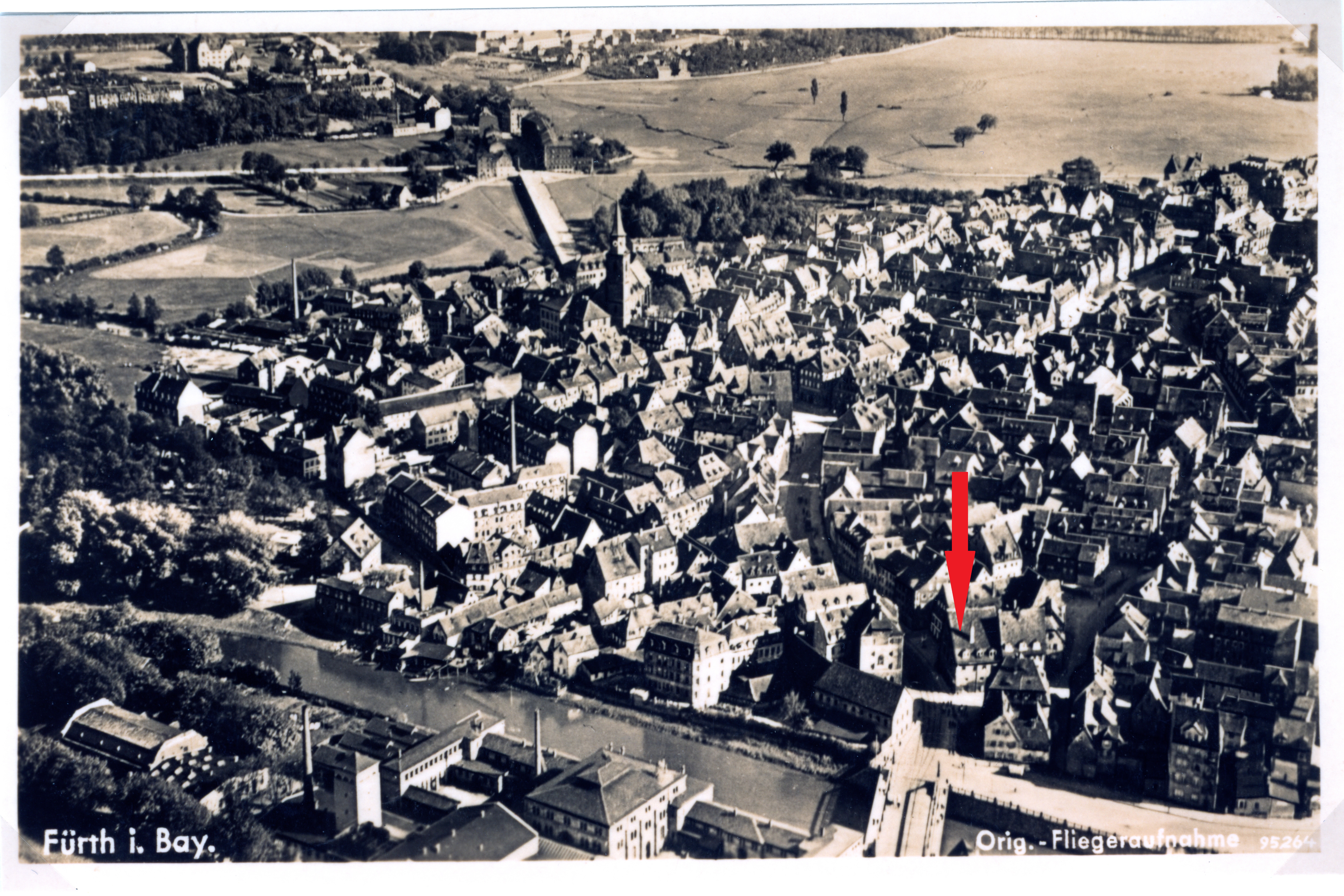 | Beschreibung | Luftbild Fürth 1936; roter Pfeil markiert Königstraße 6 | ||