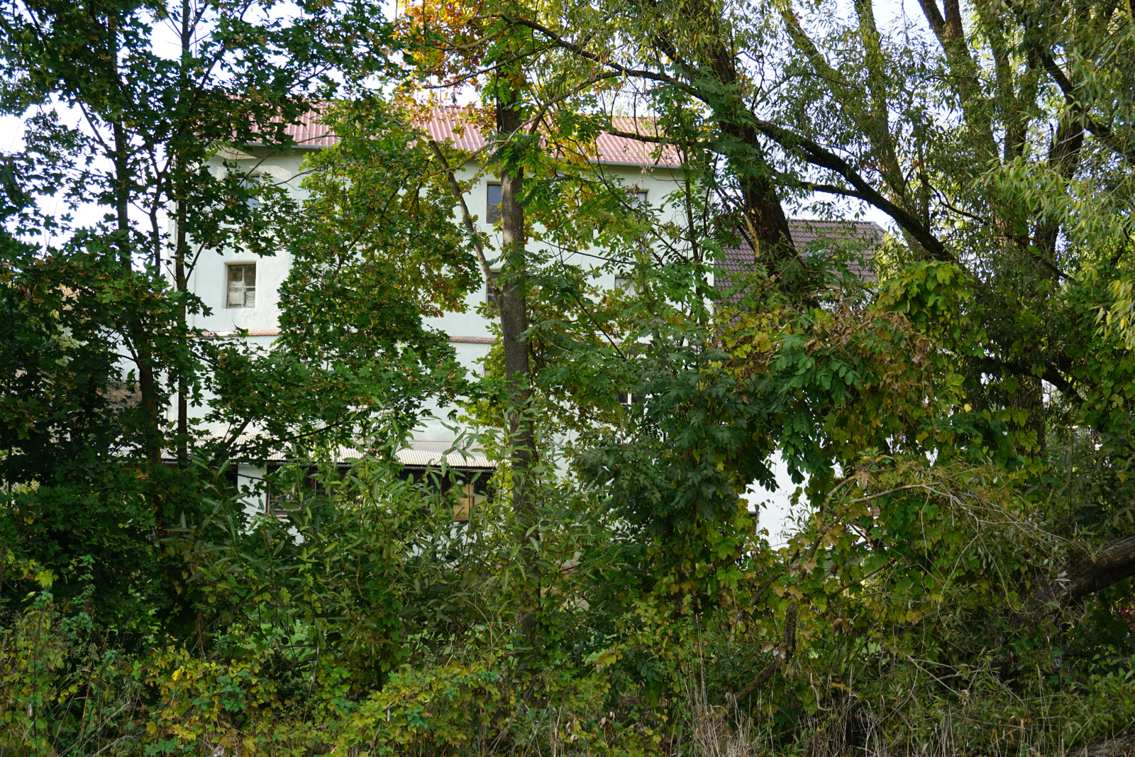 Durch Uferbewuchs eingeschränkte Sicht vom rechten Zennufer auf das Mühlengebäude; Foto: Aquilex vom 07.10.2018