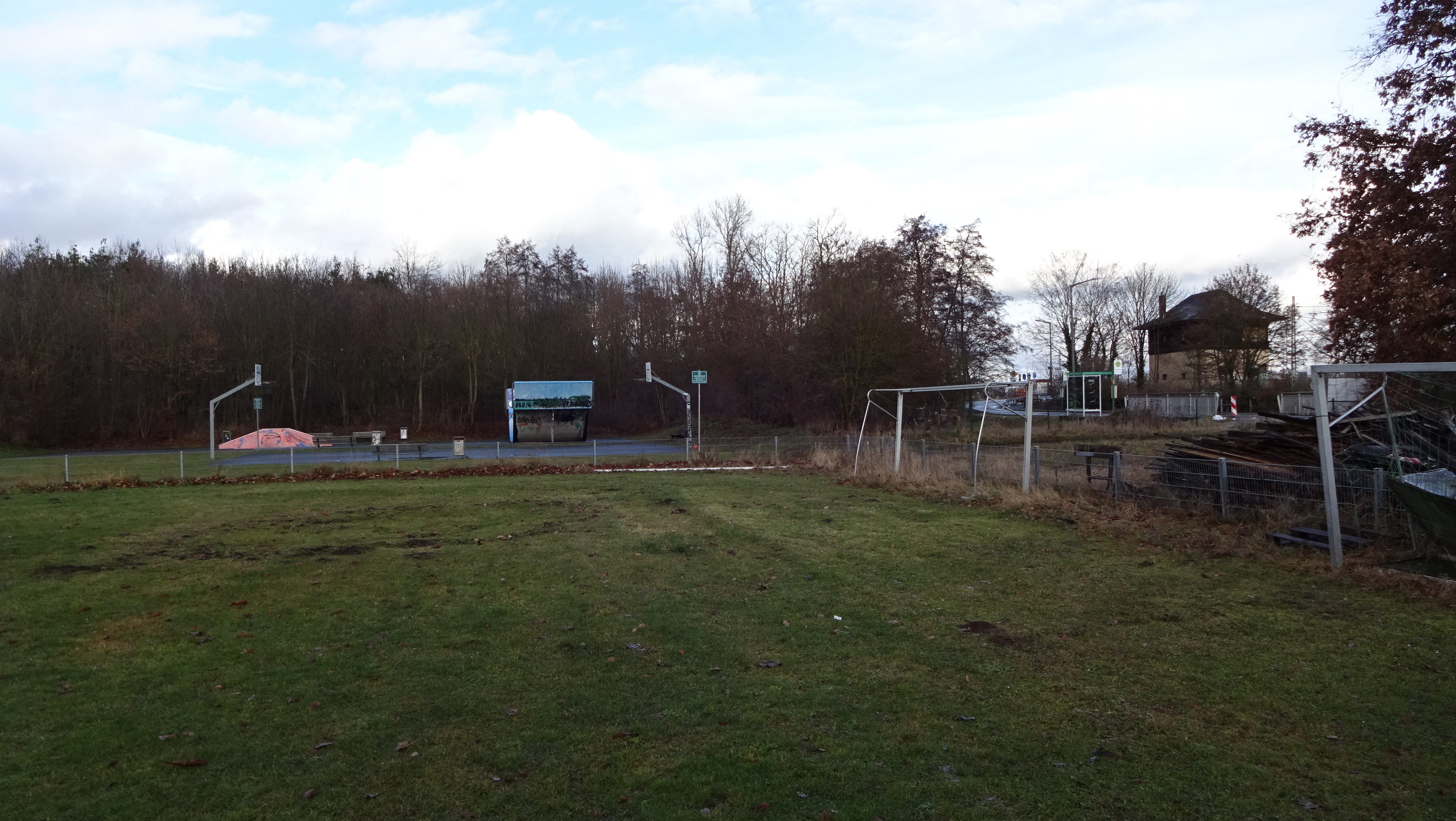| Beschreibung | MTV Stadeln e. V. Sportanlagen, im Hintergrund das ehem. Stellwerk vom Bahnhof Vach, Dez. 2021 | ||