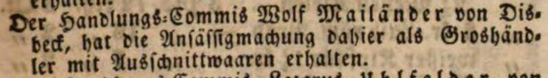 | Dateiinfo (Bild-Unterschrift und Info-Box, automatisch erstellt) | Bekanntmachung, dass Wolf Mailänder die Ansässigmachung als "Groshändler mit Ausschnittwaaren" ... Bekanntmachung, dass Wolf Mailänder die Ansässigmachung als "Groshändler mit Ausschnittwaaren" erhalten hat, September 1847<br><br>Lizenz: Non-commercial use only | ||