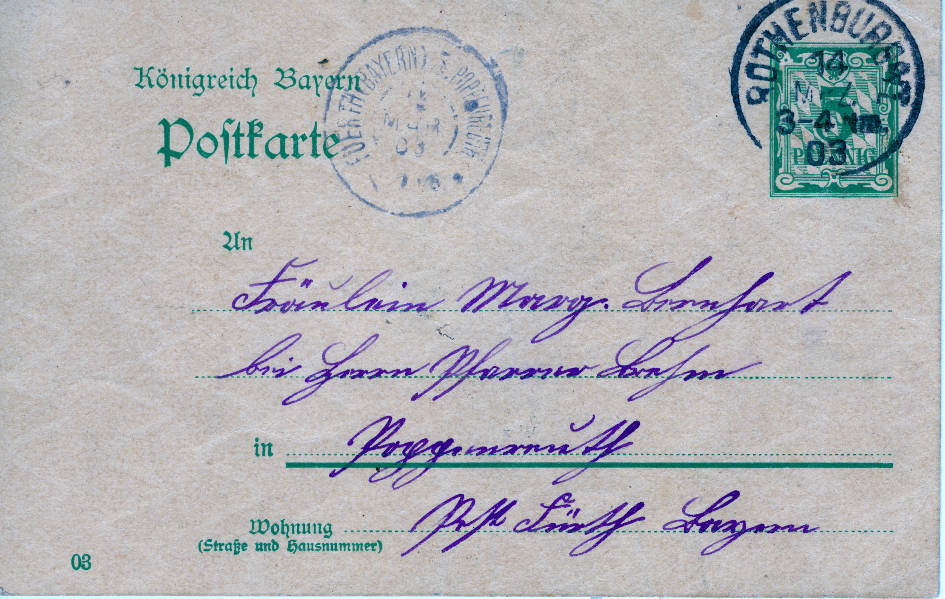 | Dateiinfo (Bild-Unterschrift und Info-Box, automatisch erstellt) | Karte an die Pfarrersmagd Margareta Bernhart Urheber: Friedrich Bernhart<br><br>Lizenz: CC BY-SA 3.0 | ||