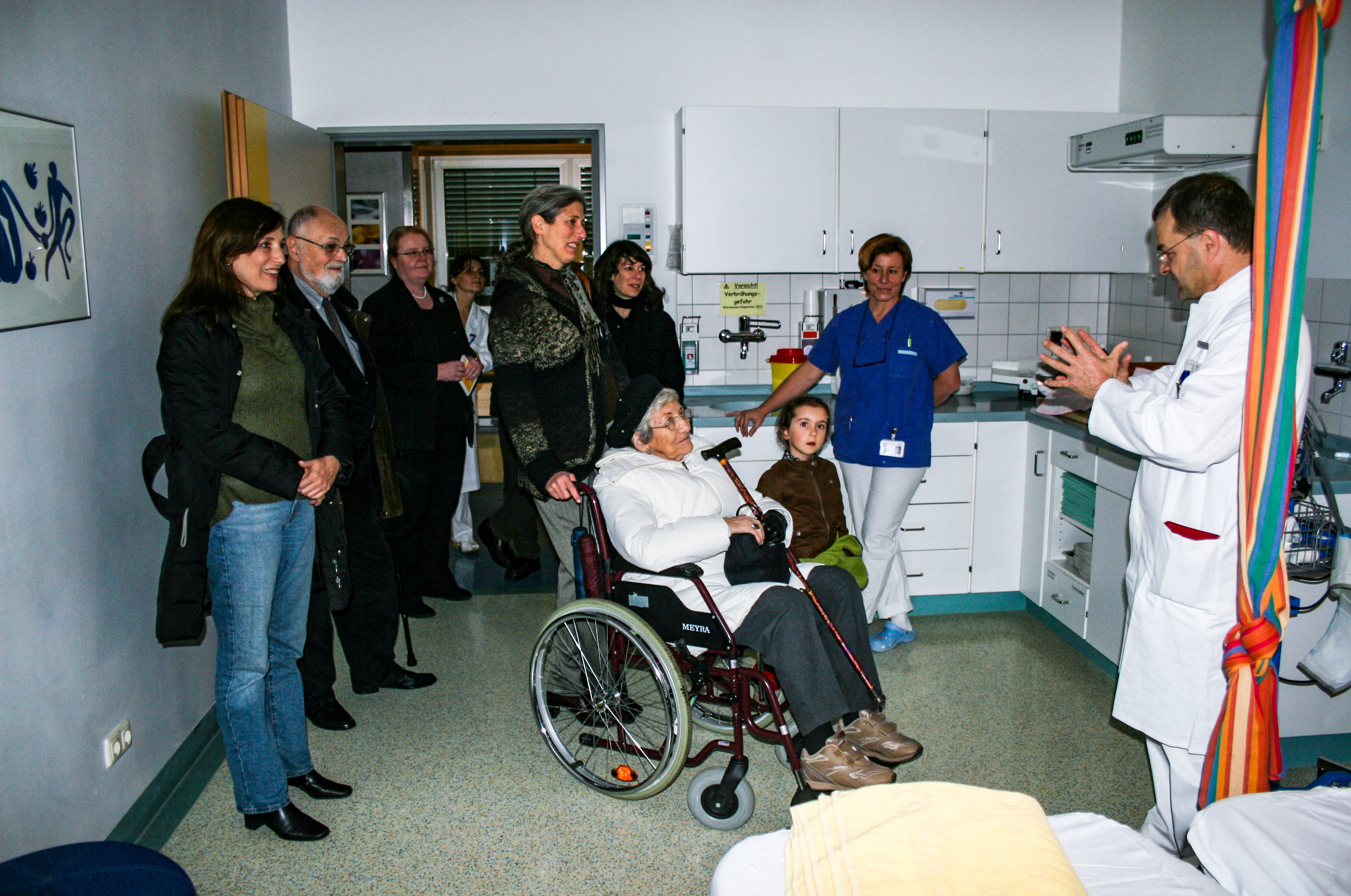 | Beschreibung | Margarete Meyers mit ihrer Familie aus der USA zu Besuch in Fürth - hier im Nathanstift mit Chefarzt Prof. Dr. Hanf und der Hebammenleitung Beate Zelinsky, Nov. 2007 | ||
