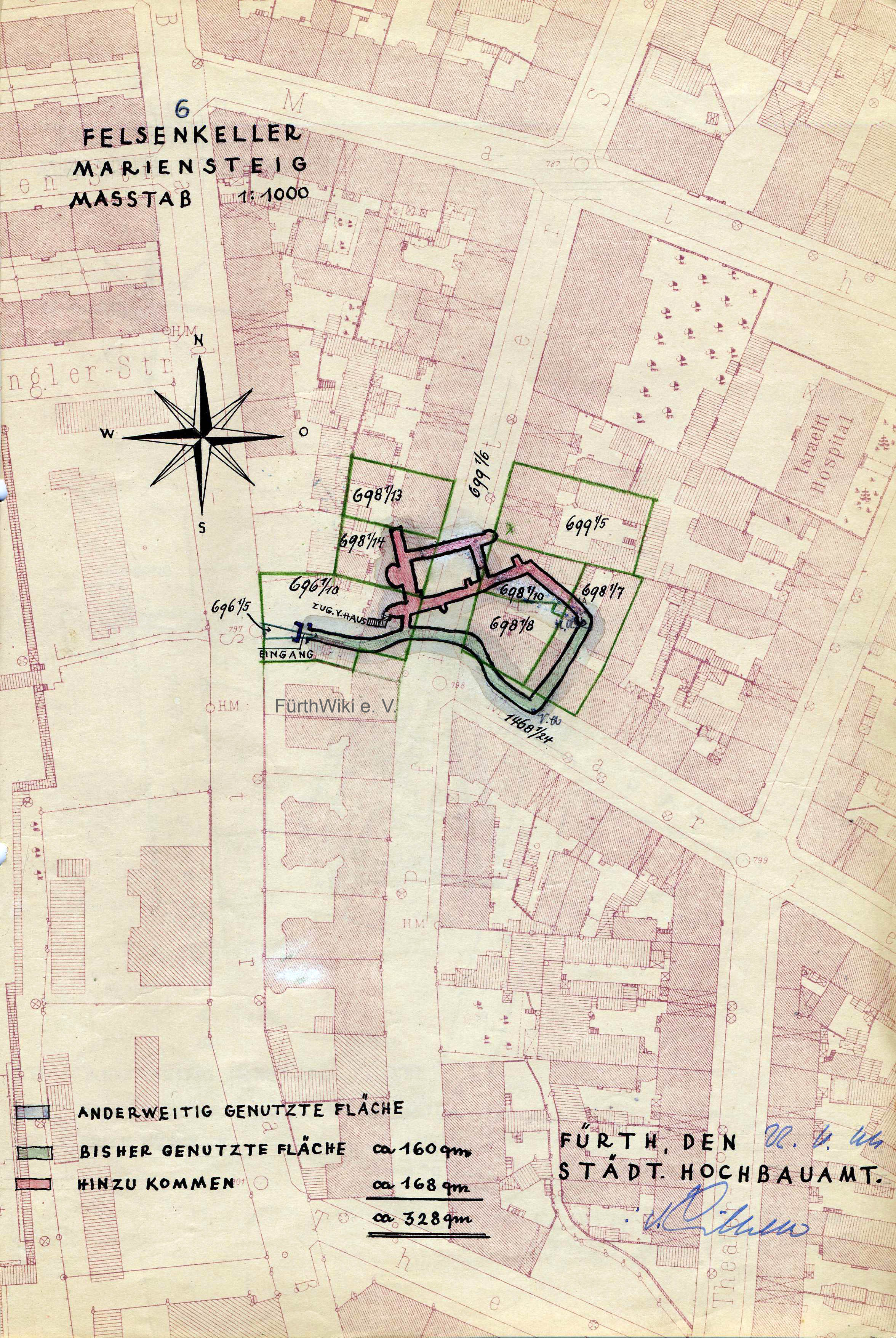 | Dateiinfo (Bild-Unterschrift und Info-Box, automatisch erstellt) | Luftschutzkeller-Plan aus dem Jahr 1944 für den Bereich Marien- und Pfisterstraße Urheber: Stadt Fürth<br><br>Lizenz: CC BY-SA 3.0 | ||