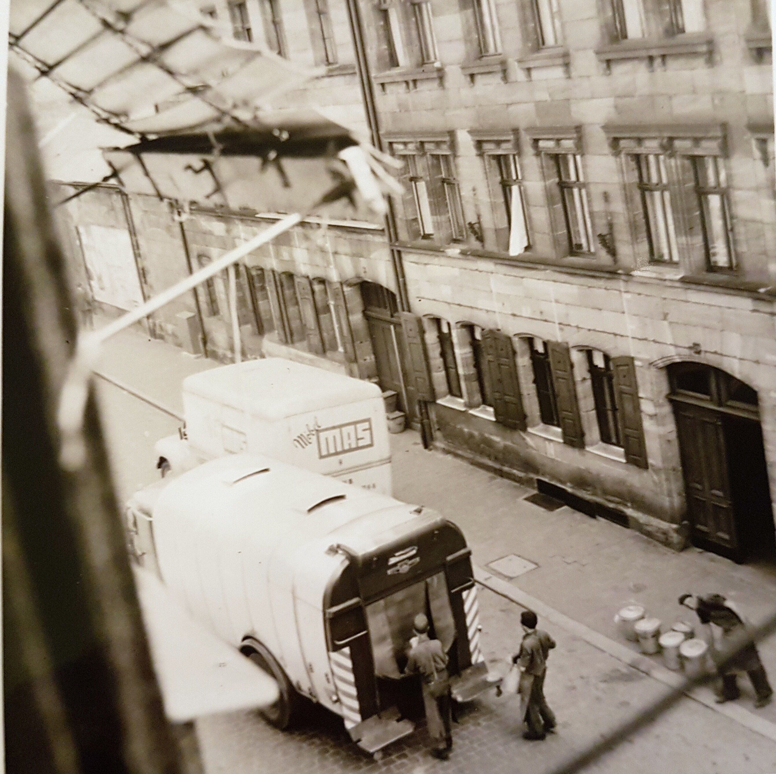 | Beschreibung | Häuser Marienstr. 27 u. 29 (aus Nr. 32 fotografiert), davor Müllabfuhr und Möbelwagen (Aufnahme 1957) | ||