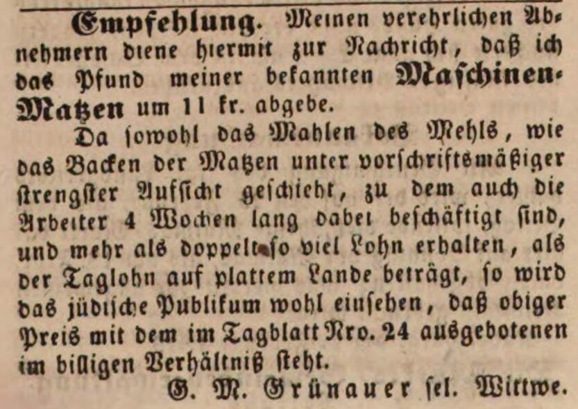 | Beschreibung | Maschinenmatzen bei Grünauer, Fürther Tagblatt 13.02.1849 | ||