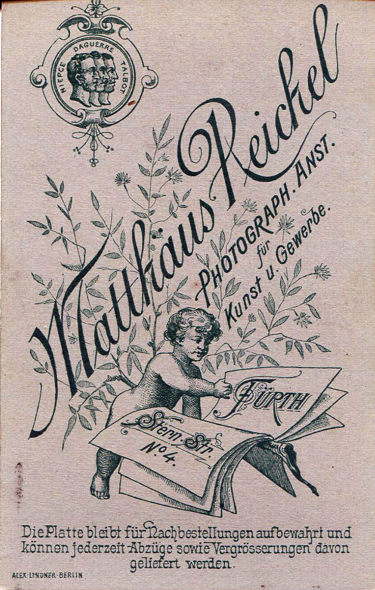 | Dateiinfo (Bild-Unterschrift und Info-Box, automatisch erstellt) | Porträtaufnahme um die Jahrhundertwende, Rückseite mit Firmenwerbung Urheber: Matthäus Reichel<br><br>Lizenz: CC BY-SA 3.0 | ||