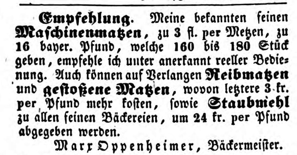 | Beschreibung | Anzeige Marx Oppenheimer, Fürther Tagblatt 11. Feb. 1851 | ||