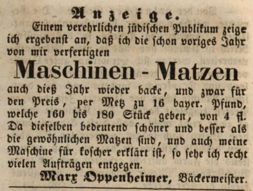 | Beschreibung | Matzenbeck Marx Oppenheimer hat auf Maschinen umgestellt, Fürther Tagblatt 18. Feb. 1846 | ||