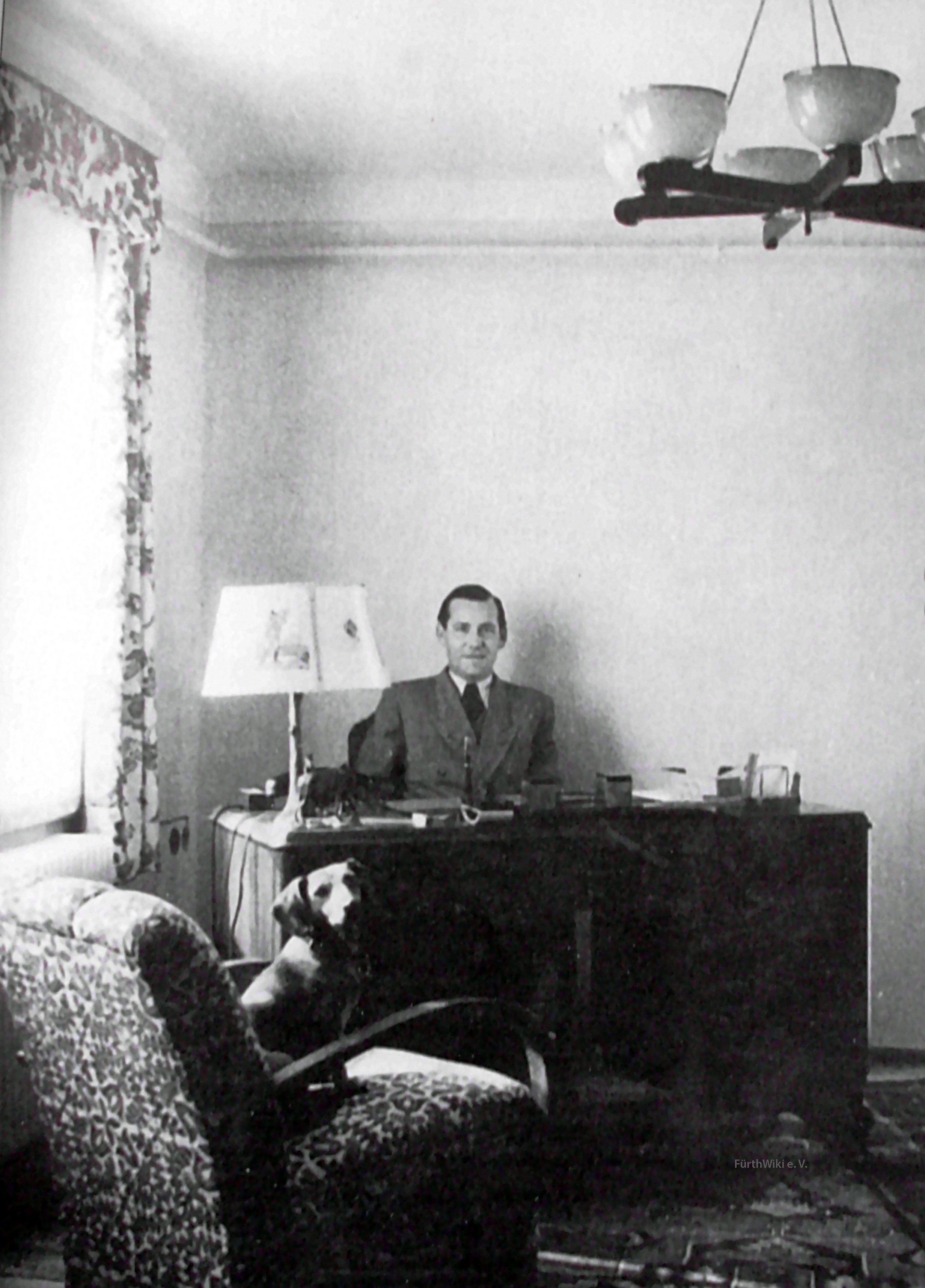 | Beschreibung | Max Grundig in seinem ersten repräsentativen Büro, links im Bild Dackel Hexi, 1947 | ||