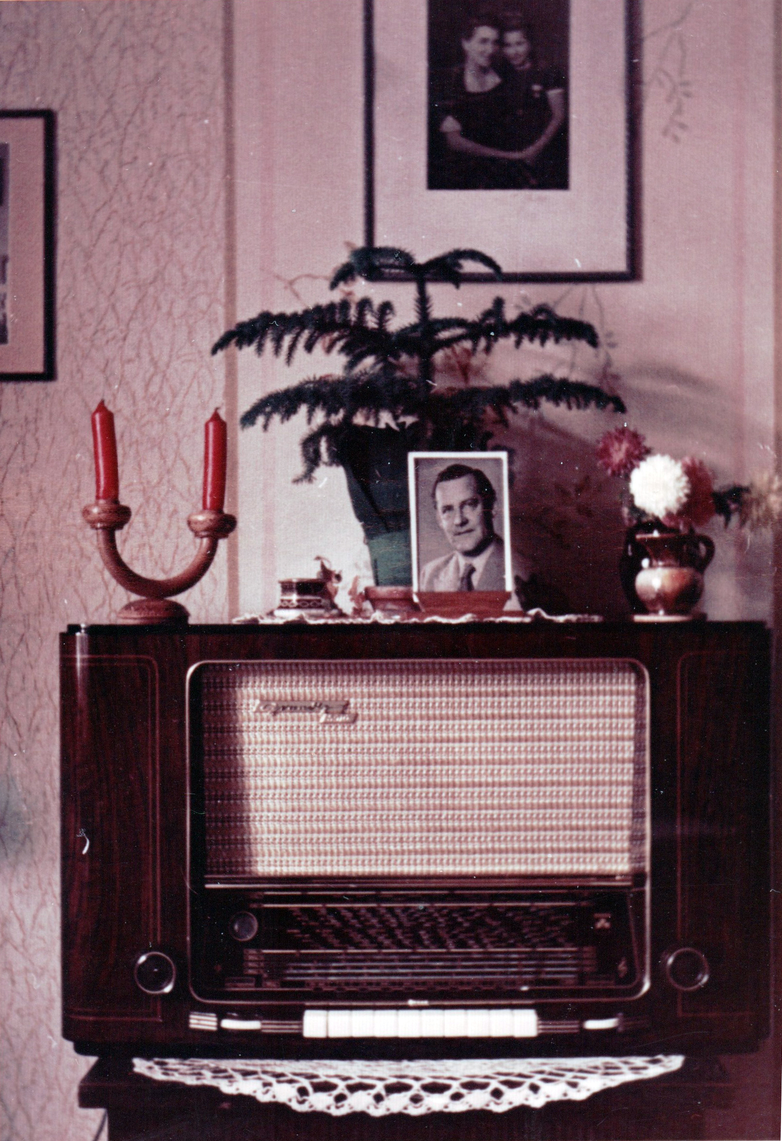 | Beschreibung | Radiogerät, Typ 4010, der Fa. Grundig in Privatwohnung mit Porträt von Max Grundig, um 1955 | ||