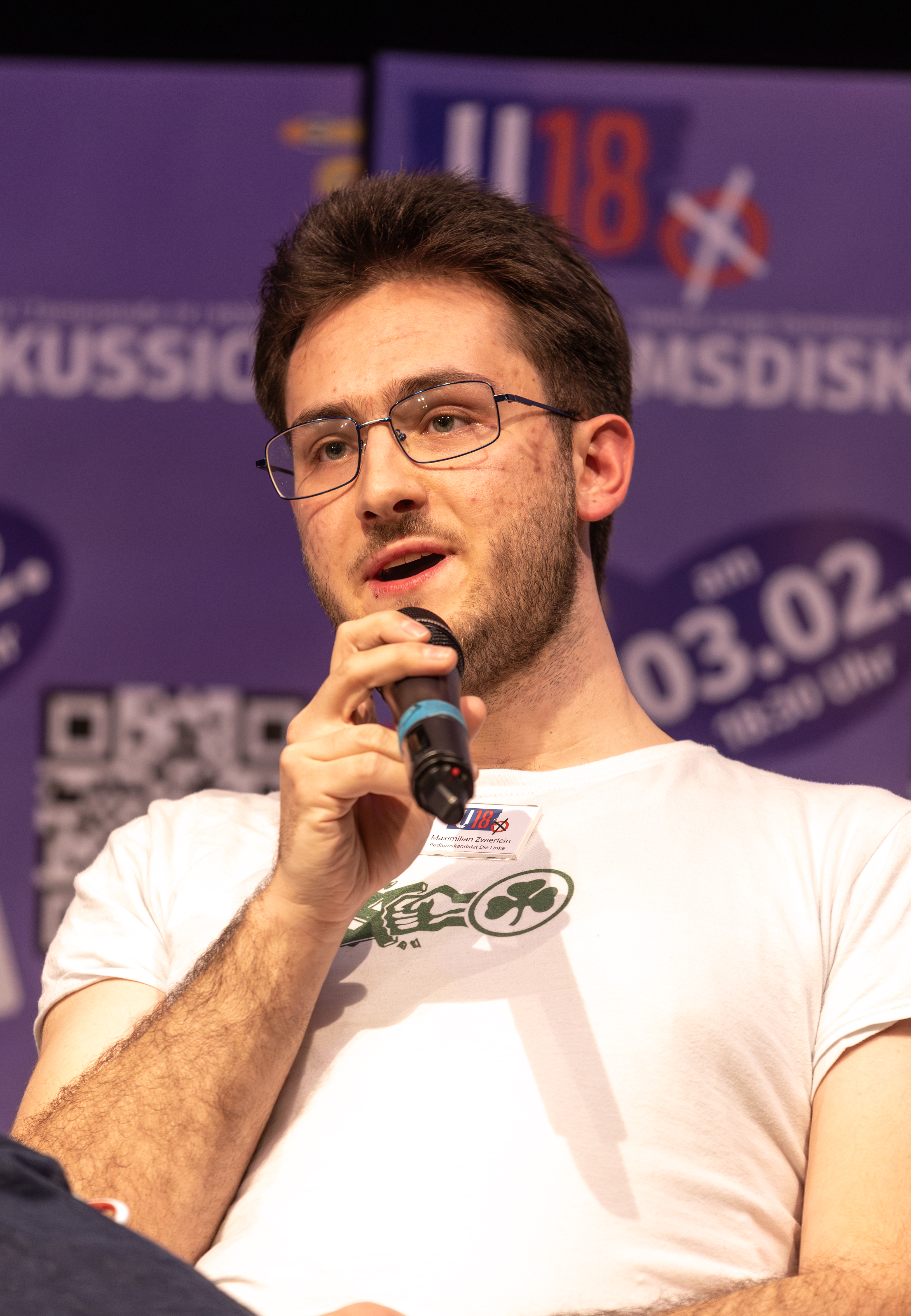 | Dateiinfo (Bild-Unterschrift und Info-Box, automatisch erstellt) | Maximilian Zwierlein von den Linken bei einer Podiumsdiskussion im Feb. 2026 Urheber: Kamran Salimi<br><br>Lizenz: CC BY-SA 4.0 | ||
