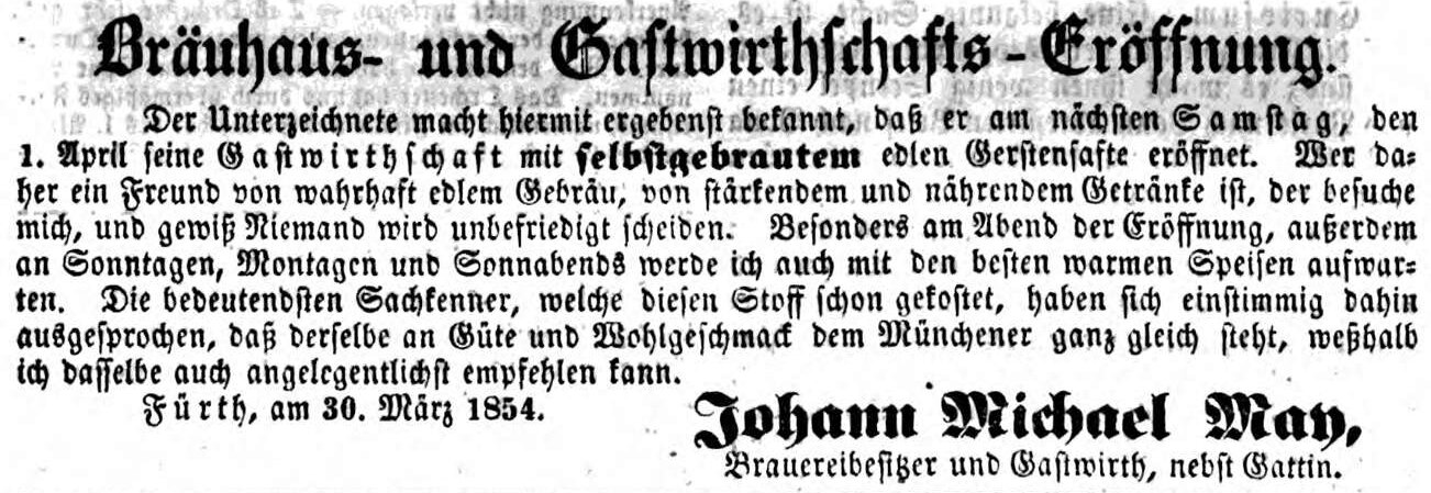 | Beschreibung | Zeitungsanzeige des Brauers Michael May, März 1854 | ||