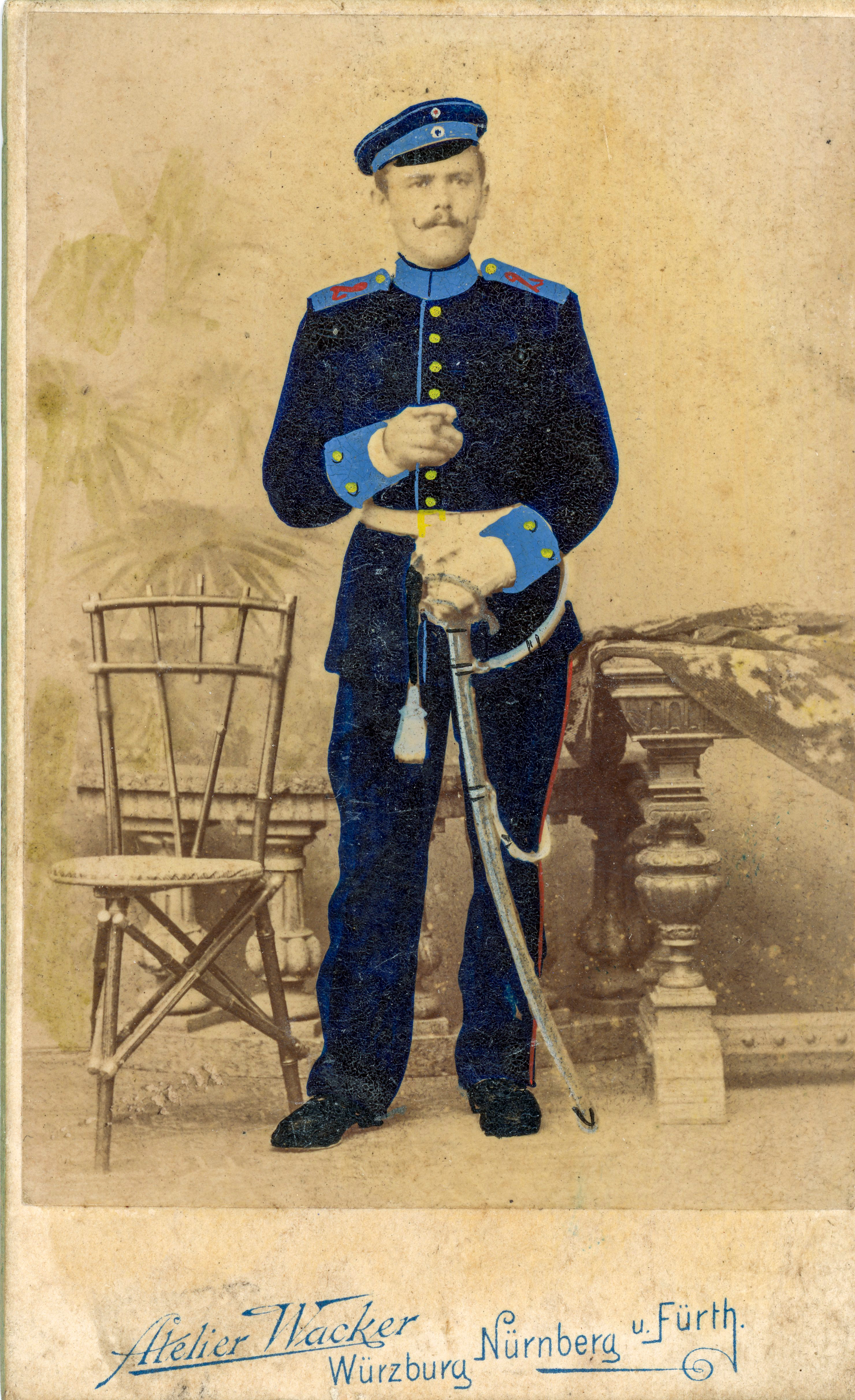 | Dateiinfo (Bild-Unterschrift und Info-Box, automatisch erstellt) | Fotos von einem unbekannten Soldaten aus dem Atelier Wacker, koloriert, ca. 1900 Lizenz: CC BY-SA 4.0 | ||