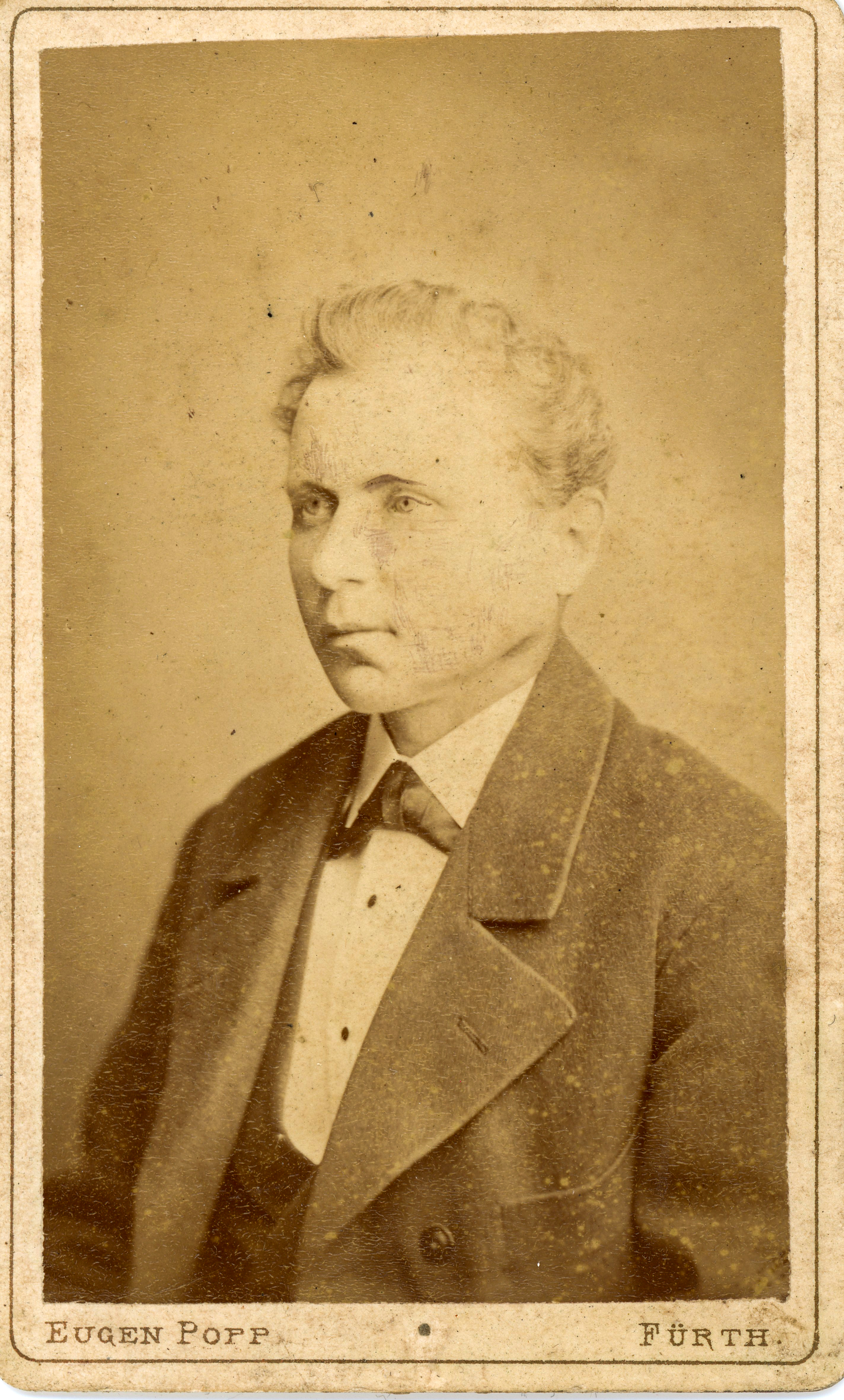 | Beschreibung | Porträt eines jungen Mannes, erstellt vom Fürther Fotografen Eugen Popp, ca. 1880 | ||