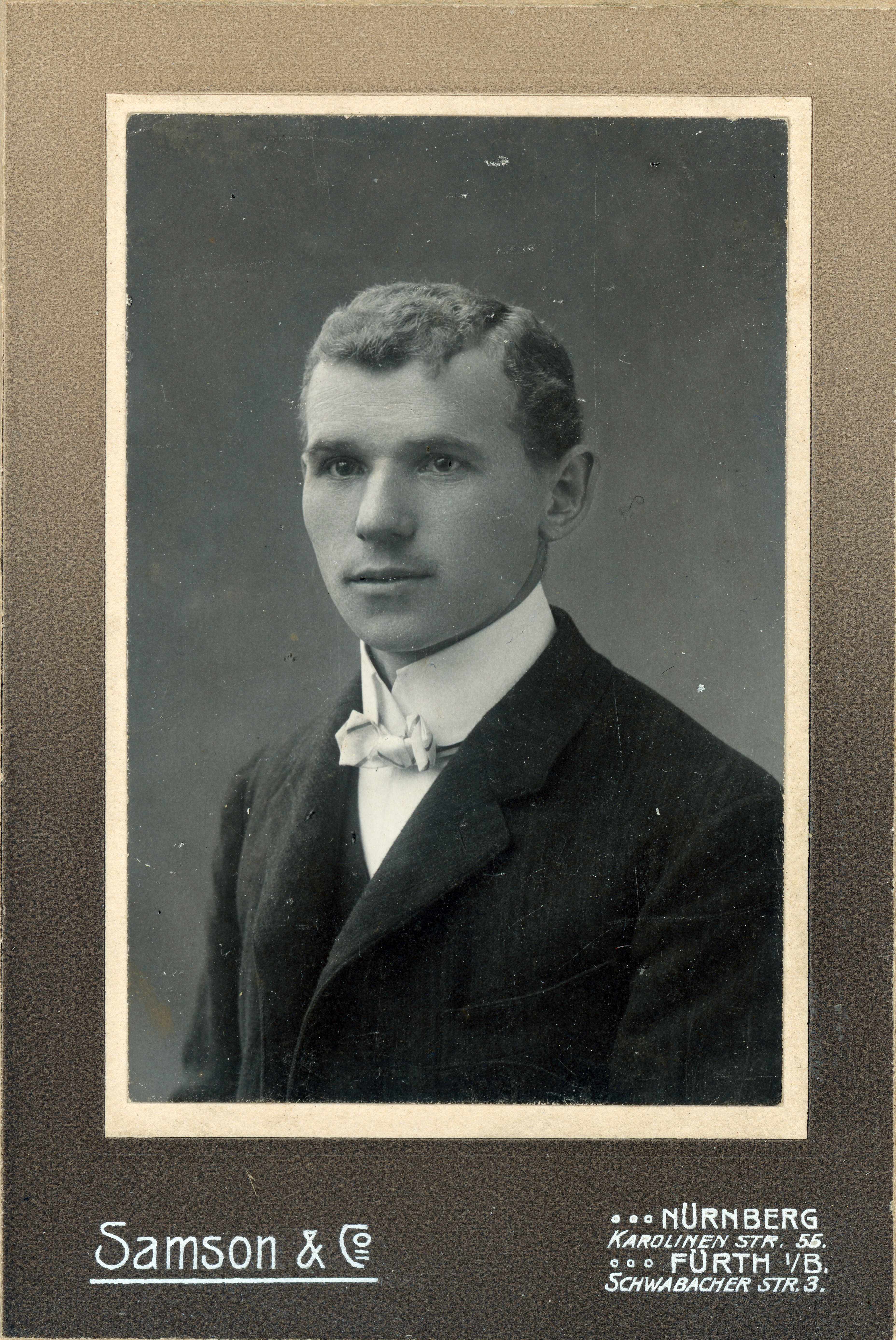 | Dateiinfo (Bild-Unterschrift und Info-Box, automatisch erstellt) | Porträt eines jungen Mannes im Anzug mit Fliege, ca. 1920 Urheber: Samson & Co.<br><br>Lizenz: CC BY-SA 4.0 | ||
