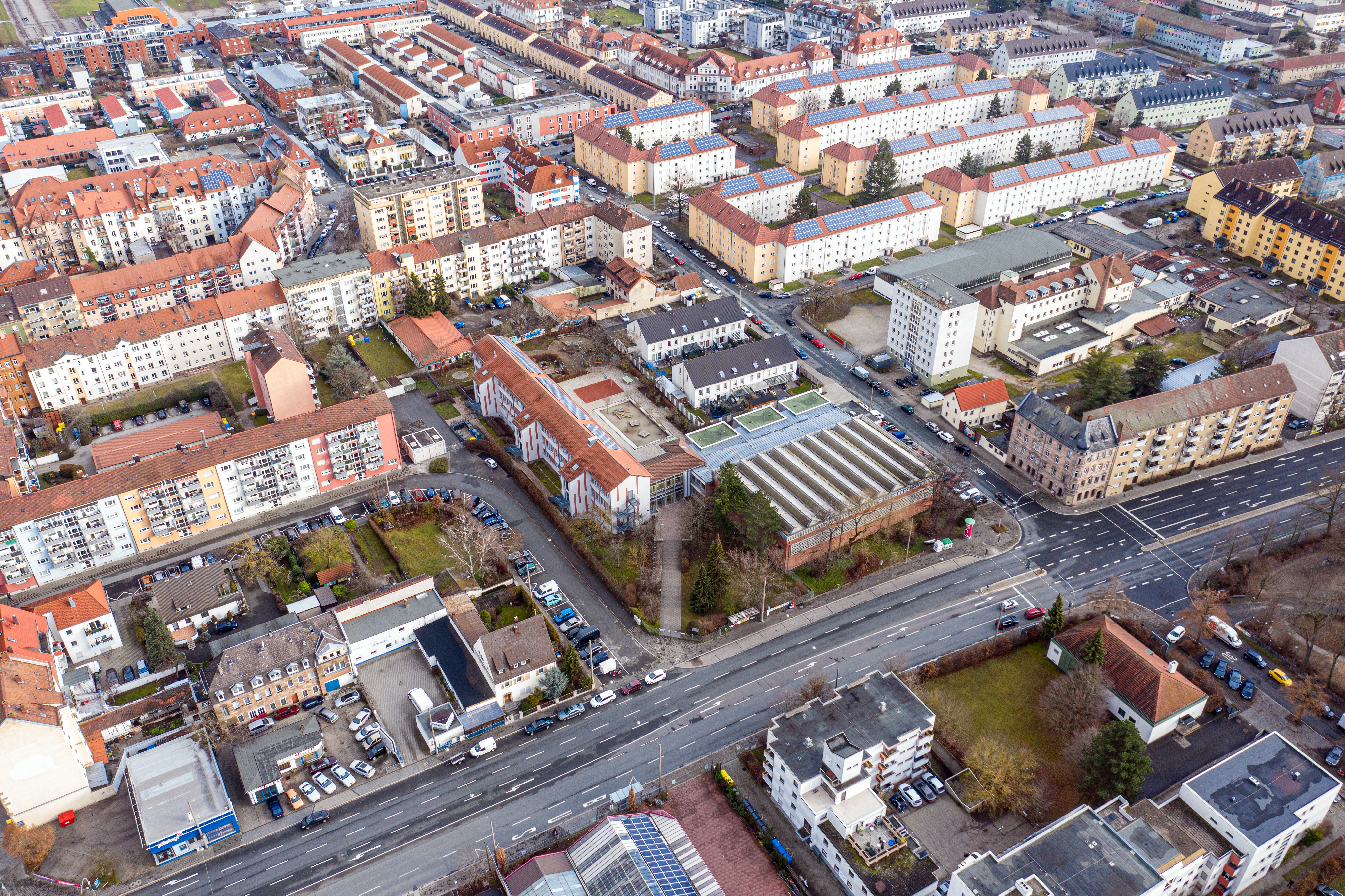| Beschreibung | Die Mittelschule Kiderlinstraße an der Schwabacher Straße, nebst der Schickedanz-Sporthalle, Dez. 2019 | ||