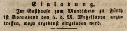 | Beschreibung | Werbeanzeige der Gaststätte "Zum Mondschein" (spätere "Zur Mist'n") zur Metzelsuppe, November 1836 | ||
