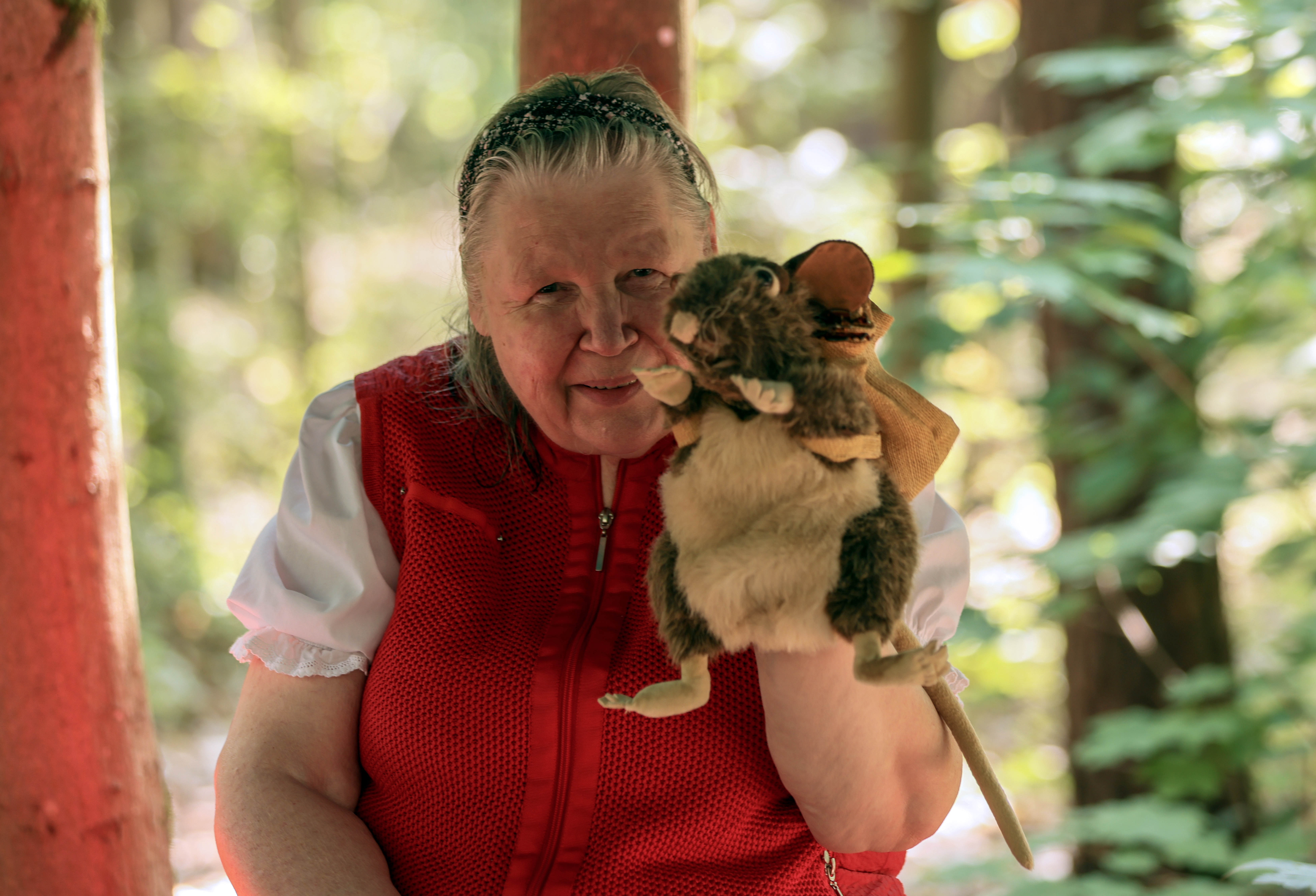 | Beschreibung | "Waldfee" Monika Weigel mit Handpuppe Rudi beim Stadtwaldfest, Sept. 2023 | ||