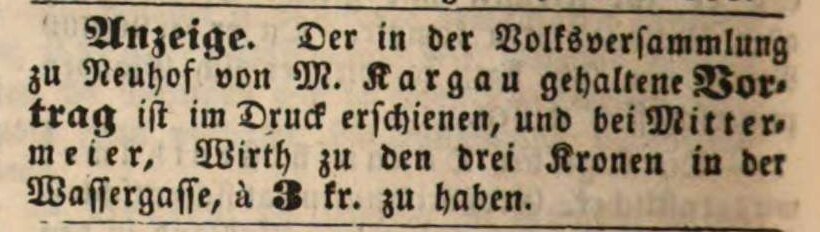 | Dateiinfo (Bild-Unterschrift und Info-Box, automatisch erstellt) | Anzeige für Moritz Kargaus gedruckten Vortrag, Fürther Tagblatt 22. September 1848 Urheber: Fürther Tagblatt<br><br>Lizenz: NoC-NC 1.0 | ||