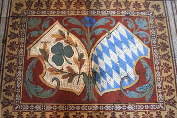 | Beschreibung | Das lorbeergekrönte Wappen der Stadt Fürth und das weiß-blaue Herzschild der Wittelsbacher. Mosaik im Fußboden des Fürther Rathaus. | ||