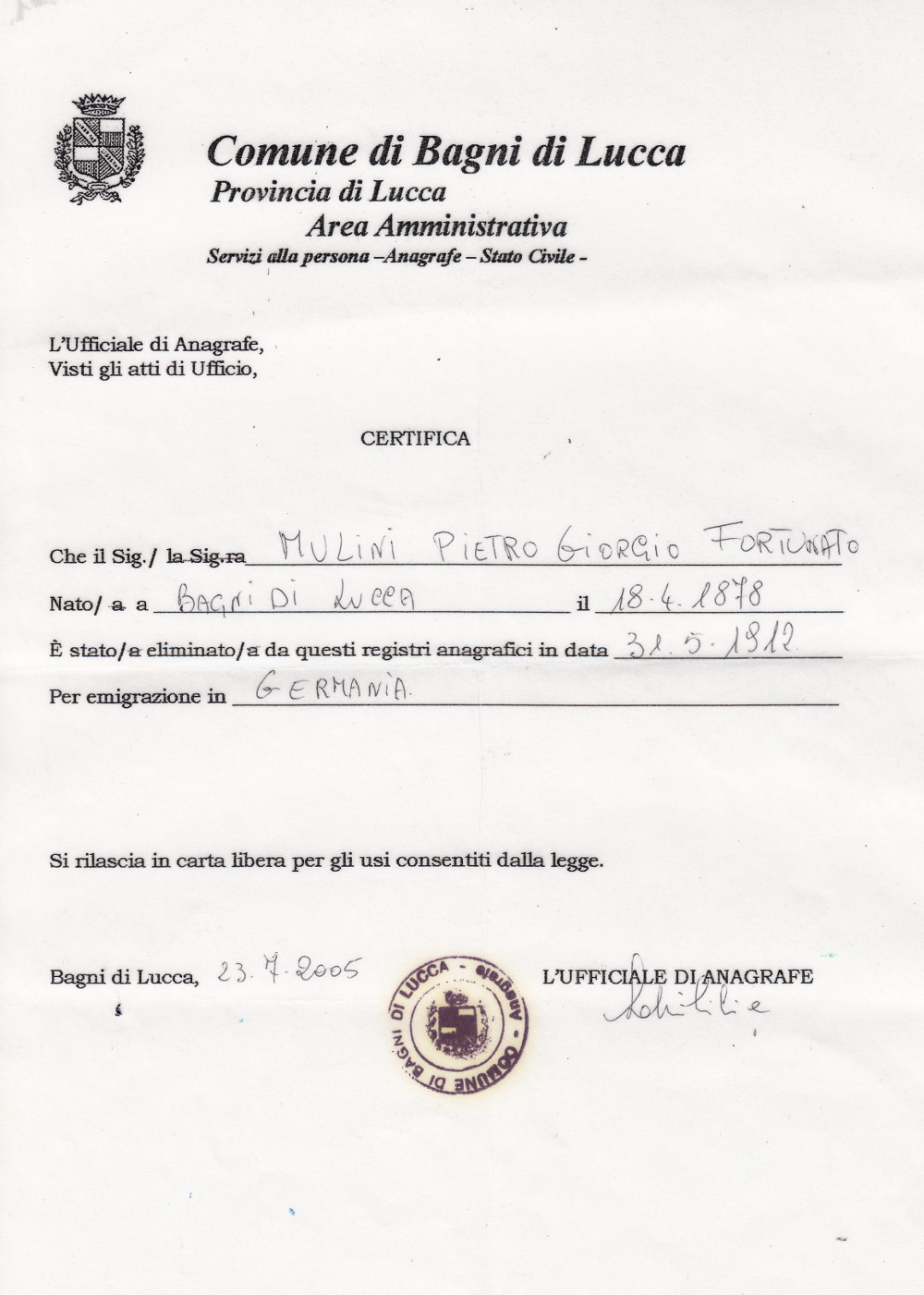 | Dateiinfo (Bild-Unterschrift und Info-Box, automatisch erstellt) | Nachweis über Mulinis Abmeldung in Bagni di Lucca, aus Italien angefordert vom Urenkel im Jahr 2005 Urheber: Famlilie Mulini<br><br>Lizenz: CC BY-SA 3.0 | ||
