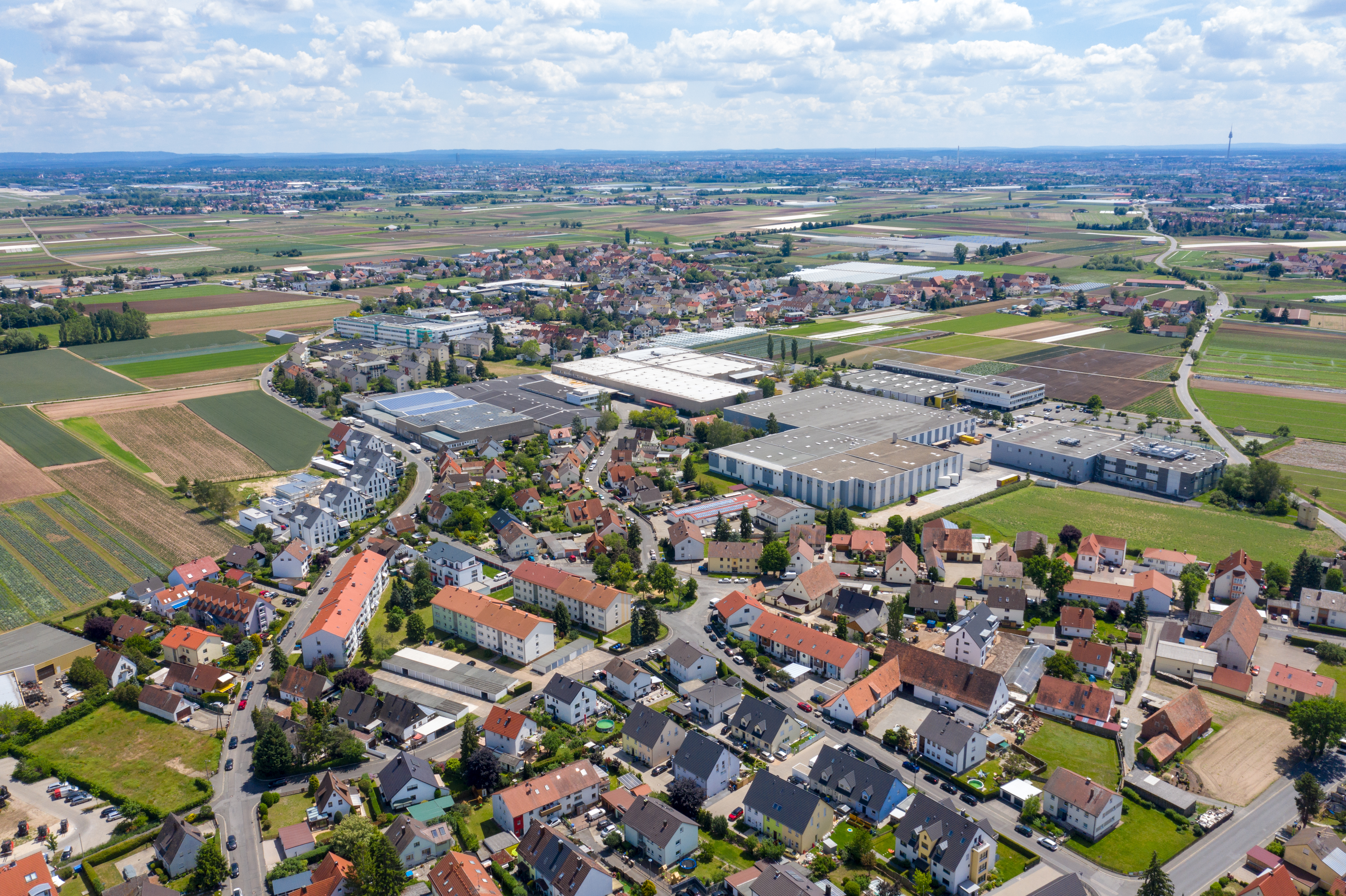 | Beschreibung | Blick von Norden nach Süden über Bislohe und Sack - im Hintergrund Nürnberg, links oben im Bild die Firma Phoenix Pharmahandel Aktiengesellschaft & Co. KG - rechts Zweirad-Center Stadler Fürth GmbH, Mai 2019 | ||