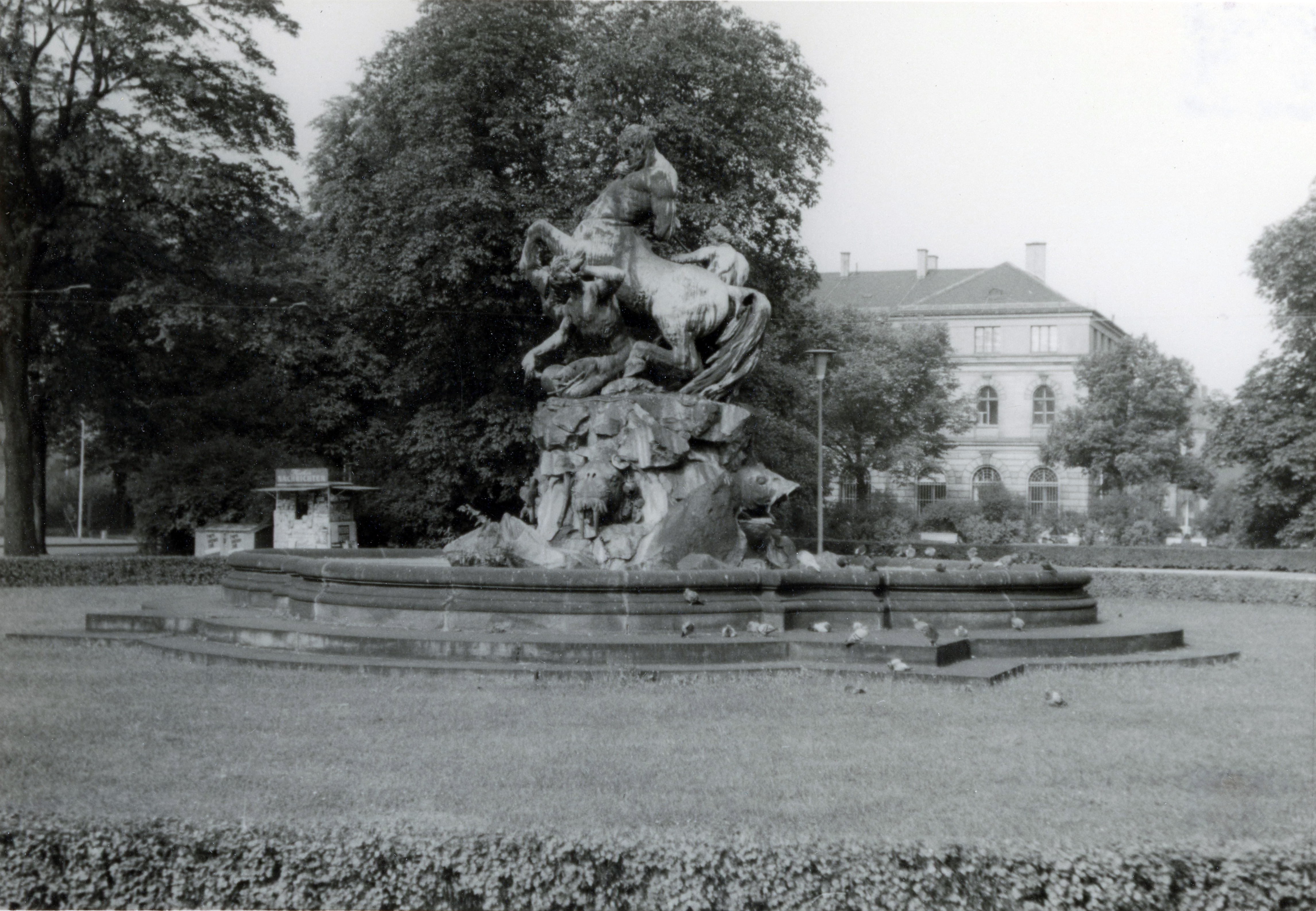 | Beschreibung | Der Centaurenbrunnen am Bahnhofplatz, im Hintergrund die ehem. Hauptpost, Juli 1967 | ||