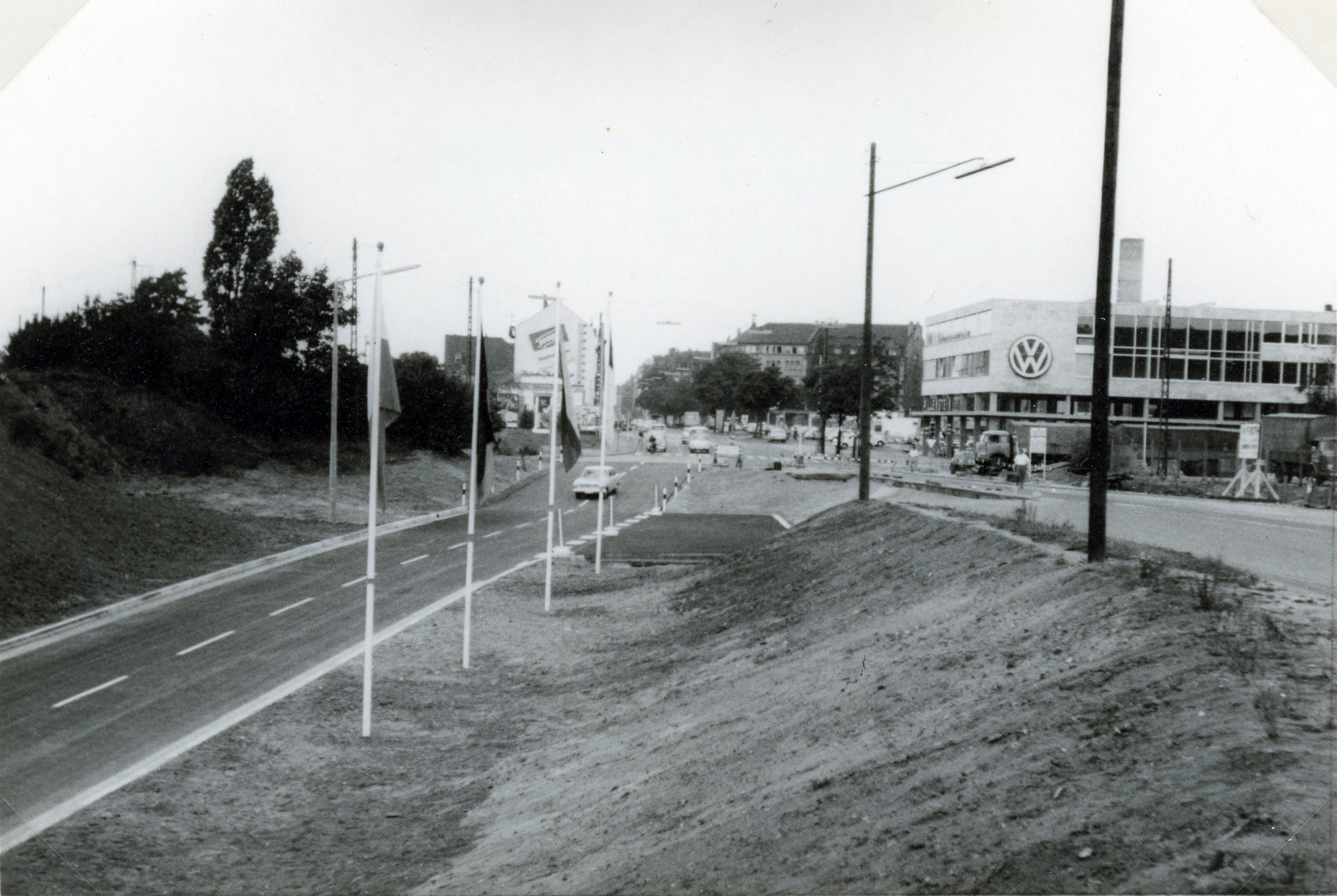 | Beschreibung | Teileröffnung des neuen Frankenschnellwegs (A73) an der Stadtgrenze zur Nachbarstadt Nürnberg - im Hintergrund das Autohaus Pillenstein, Juli 1967 | ||