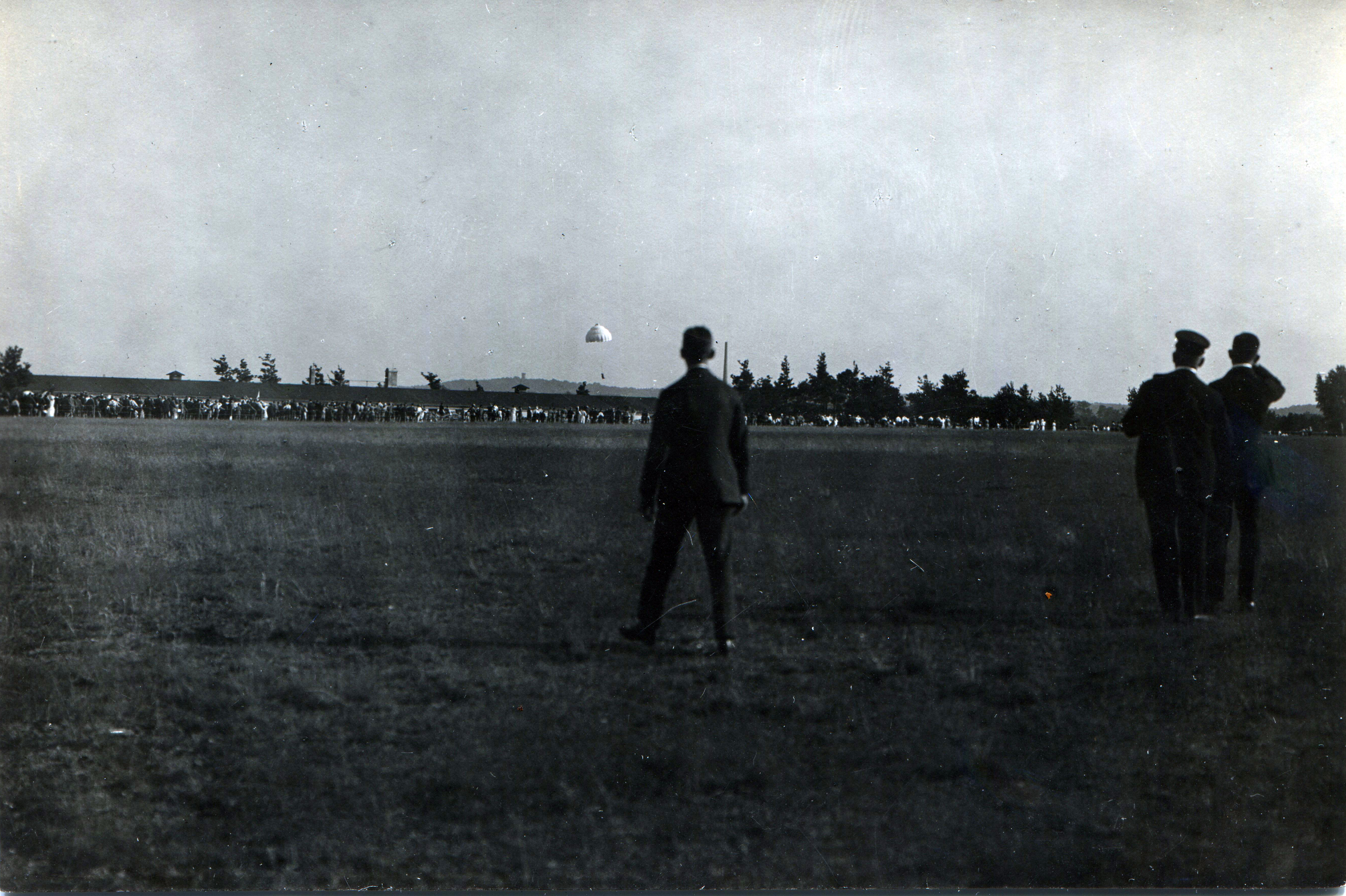 | Beschreibung | Fallschirmlandung mit Publikum am Flugplatz in Atzenhof - im Hintergrund die Alte Veste, ca. 1920 | ||