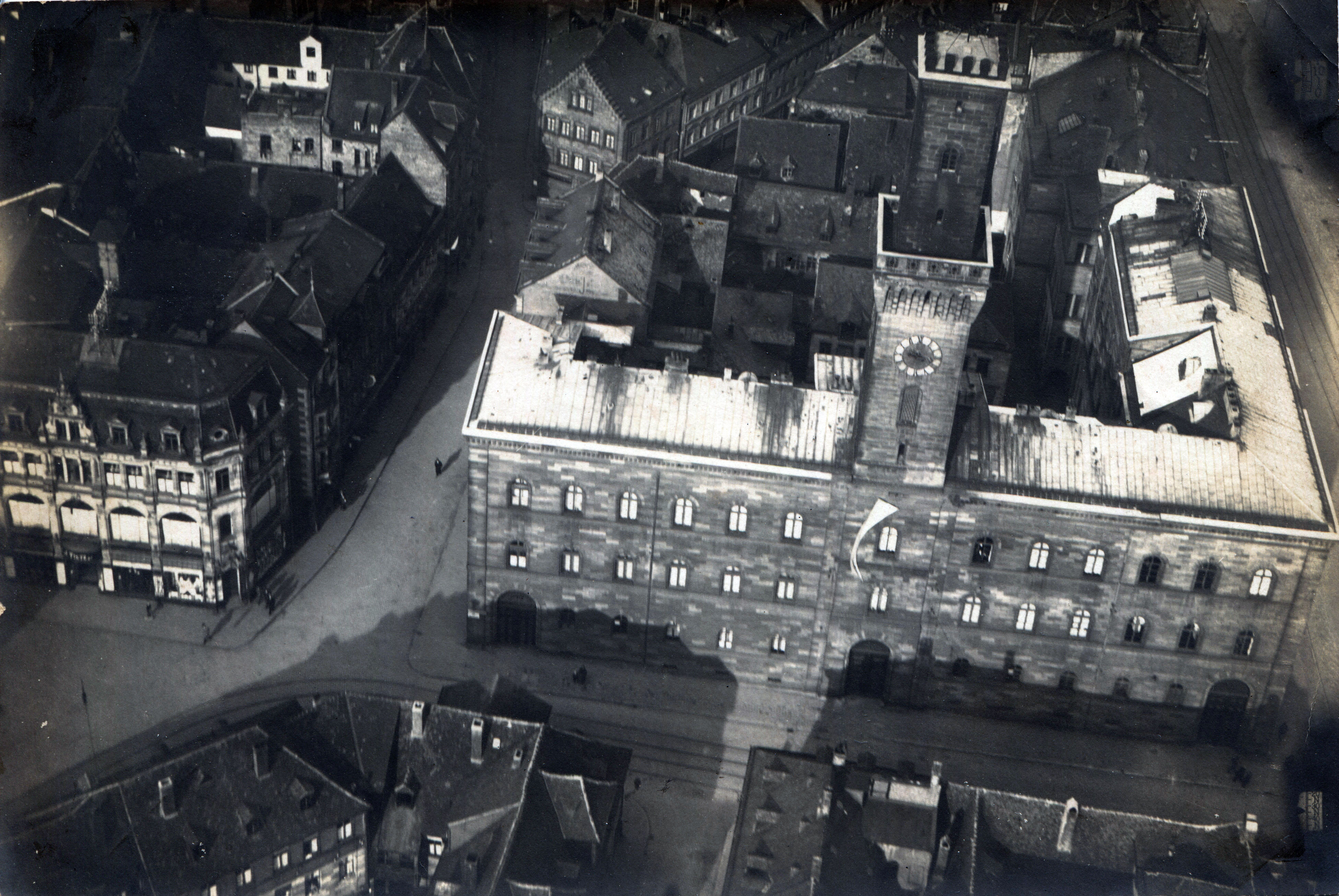 | Beschreibung | Luftaufnahme auf das Rathaus mit Blick in die Sternstraße (Ludwig-Erhard-Straße), ca. 1935 | ||