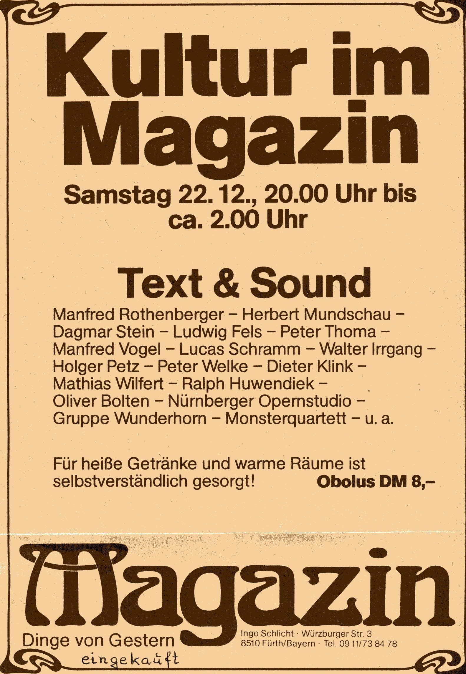 | Beschreibung | Kulturveranstaltung Werbeanzeige "Kultur im Magazin" mit Text und Sound bis 2 Nachts Gebäude Würzburger Straße 3/Foerstermühle am 22.12.1979 | ||