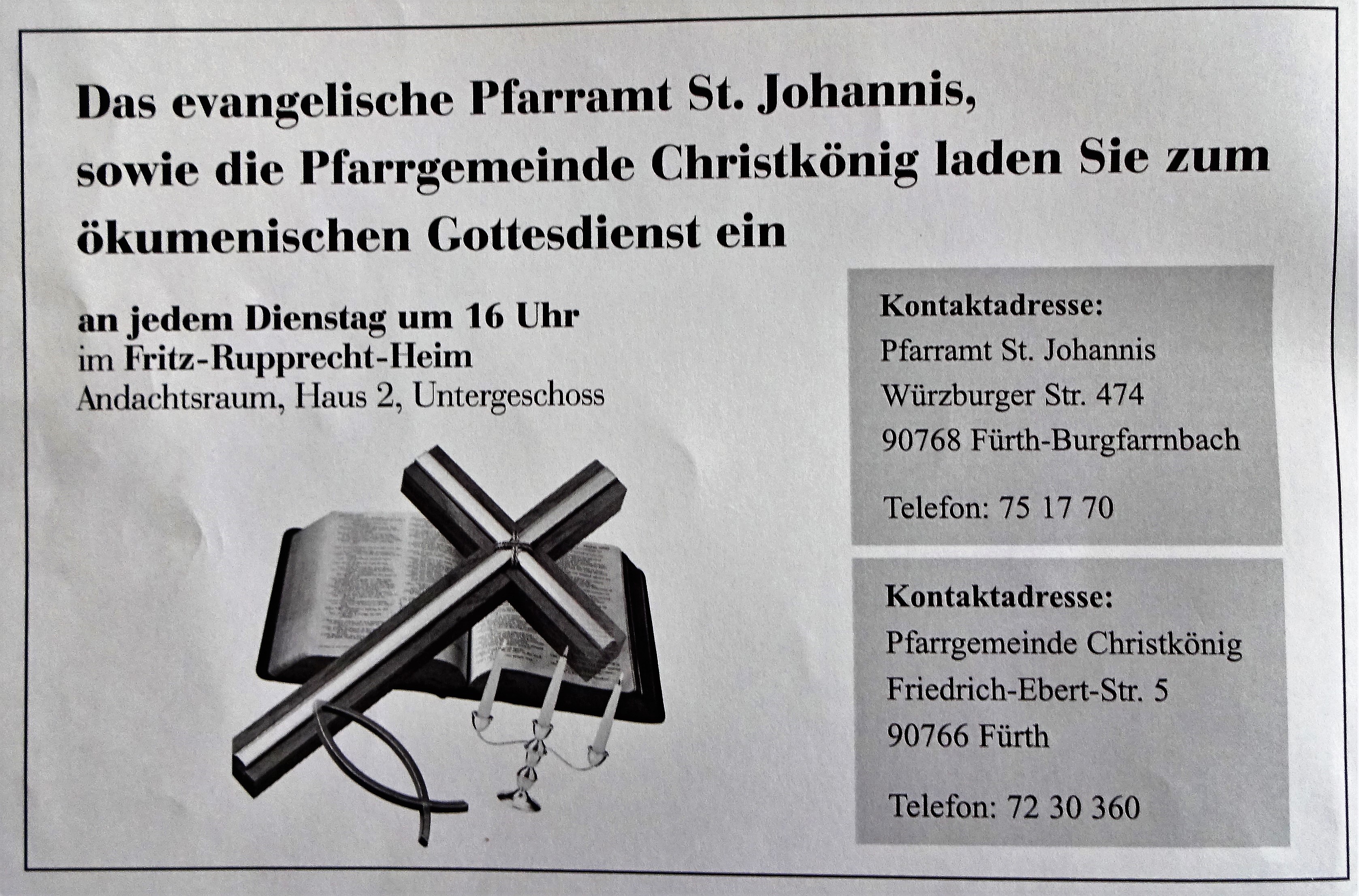| Dateiinfo (Bild-Unterschrift und Info-Box, automatisch erstellt) | Gottesdienst Einladung Evang. Pfarramt Kirche St. Johannis im Fritz-Rupprecht-Heim 1978 Urheber: Klaus-Peter Schaack<br><br>Lizenz: CC BY-SA 3.0 | ||